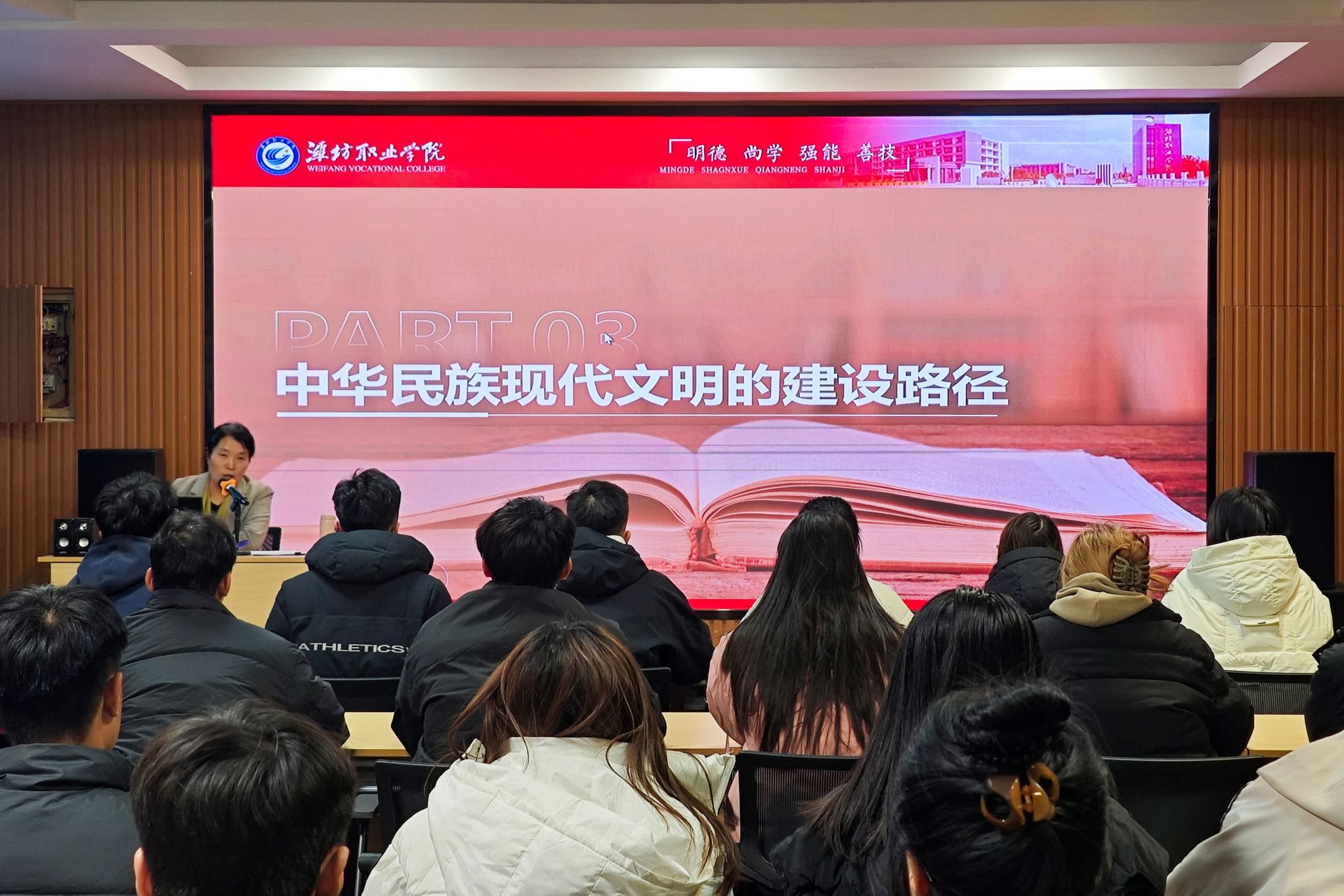 为深入学习贯彻党的二十大和二十届三中全会精神,推动习近平总书记对学校思政课建设指示的全面落实,帮助同学们进一步坚定和增强文化自信。11月26日下午,学院党委委员、宣传部(精神文明建设办公室)部长(主任)鞠桂芹深入文化创意学院为同学们带来了《深刻认识中华民族现代文明》专题思政课,文化创意学院30名学生参加。本次思政课从中华民族现代文明的鲜明特质、中华民族现代文明的发展动力、中华民族现代文明的建设路径三个方面展开深刻剖析,...更多