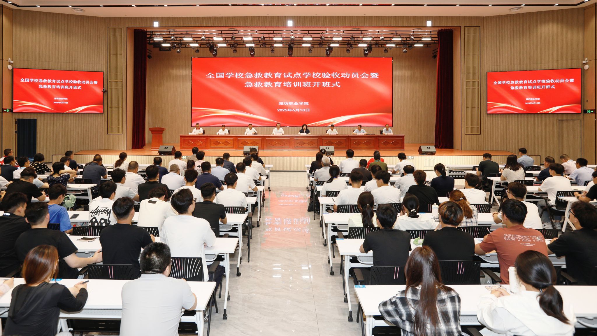 6月10日上午,学院在滨海校区综合楼报告厅召开全国学校急救教育试点学校验收动员会暨急救教育培训班开班式。潍坊市委社会工作部副部长王洪海,共青团潍坊市委书记李飞,潍坊市应急管理局党委委员、副局长崔鹏,潍坊市红十字会党组书记王辉等领导莅临现场并致辞。学院党委书记王浩、院长韩瑞东,党委委员、副院长赵宏坤出席。潍坊先锋应急救援促进中心主任任永亮一行8人以及学院各职能部门、二级学院负责同志,师生代表,培训班学员共计180 ...更多 -