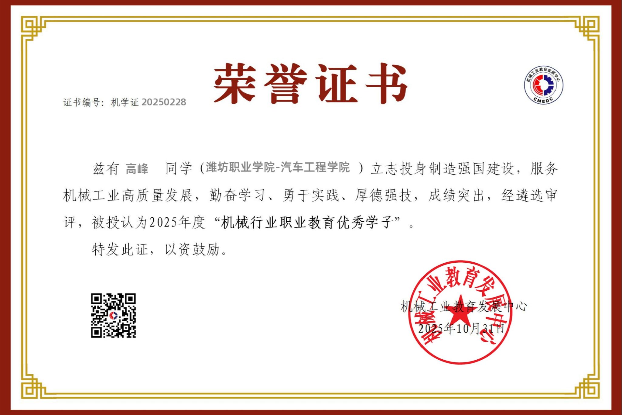 近日,首届“机械行业职业院校优秀学子”遴选认定工作结果正式揭晓。经院校推荐、专家评审及公示程序,全国共496名2025届毕业生获此殊荣。MG冰球突破官网机电工程学院刘璐璐、崔晓阳,汽车工程学院高峰、潘洪俊四位同学凭借优异的综合素质和突出的专业技能成功入选。此次“机械行业职业院校优秀学子”遴选活动,由机械工业教育发展中心牵头组织,旨在深入贯彻国家制造强国战略,响应建设一流产业技术工人队伍的时代号召,浓厚“学制造、干制造、...更多