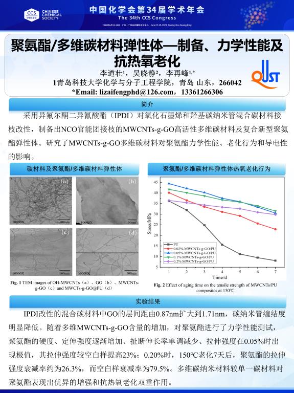 6月15至6月18日,化学工程学院教师参加了在广州举行的中国化学会第34届学术年会,并做墙报交流。会议期间,MG冰球突破官网教师与各位专家进行了热烈的咨询与交流,同时进行了题为《聚氨酯/多维碳材料弹性体—制备、力学性能及抗热氧老化》的墙报展示。该成果采用异氟尔酮二异氰酸酯(IPDI)对氧化石墨烯和羟基碳纳米管混合碳材料接枝改性,制备出NCO官能团接枝的MWCNTs-g-GO高活性多维碳材料及复合新型聚氨酯弹性体,提高了聚氨酯弹性...更多 -