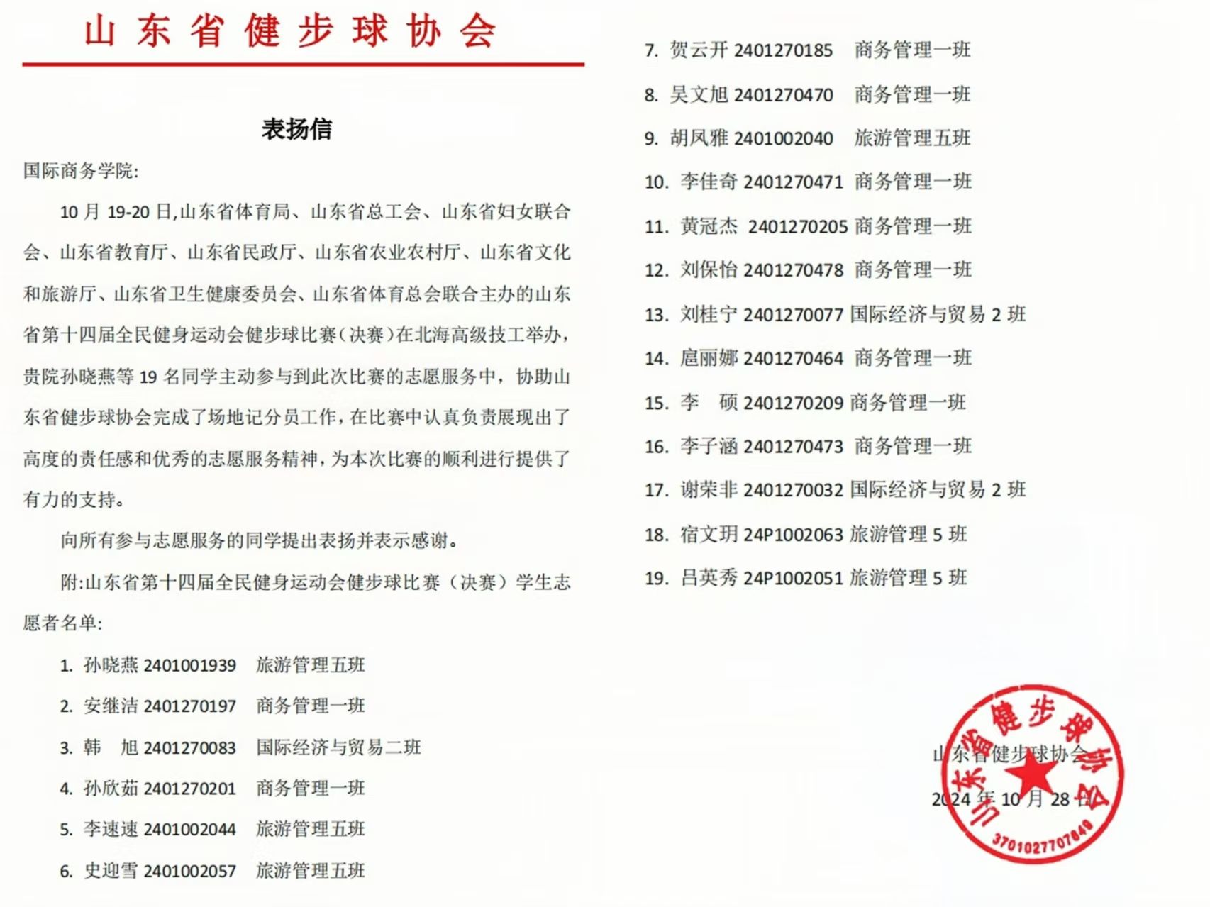 国际商务学院收到山东省健步球协会感谢信