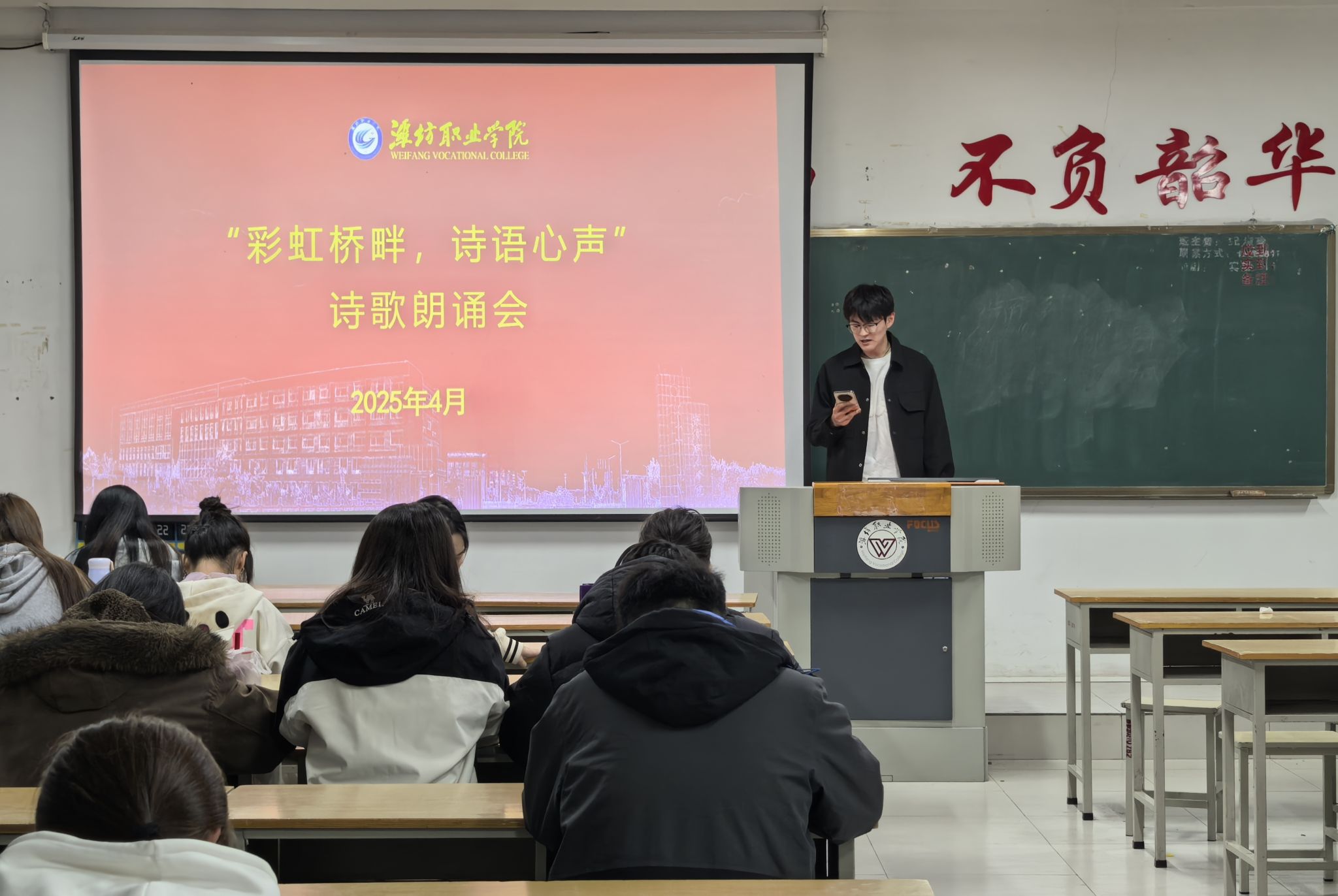 为丰富校园文化生活,展现食药学子人文风采,弘扬中华诗歌文化,激发青年学生的文学热情,绿竹社区于4月17日开展“彩虹桥畔,诗语心声”主题诗歌朗诵会。本次活动以经典传承与创新表达为主线,设置经典诗作品鉴与原创作品展示两大环节。活动现场,朗诵者们通过声情并茂的演绎,将文字蕴含的情感力量生动传递给观众。参与者或深情诵读《将进酒》《春江花月夜》等经典诗篇,在抑扬顿挫间展现千年诗韵;或倾情呈现原创作品,用青春之声诠释时代风貌,...更多 -