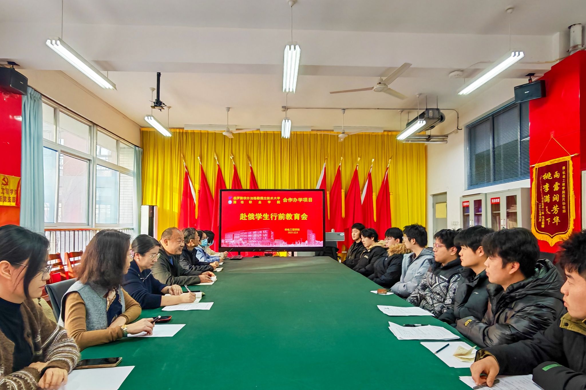 为扎实推进中俄合作办学项目落地见效,帮助即将赴俄留学的学子做好充分准备、顺利开启海外求学之旅,12月8日,机电工程学院在惠泽2A-221会议室召开赴俄学生行前教育会,机电工程学院主要负责人、国际交流处副处长、电气自动化技术教研室负责人、相关教师、中俄班辅导员以及即将赴俄罗斯留学学生共同参加会议。会议伊始,机电工程学院主要负责人向即将出发的学生表示祝贺。他在讲话中着重强调,中俄合作办学项目是学院推进国际化人才培养的重要载体,...更多