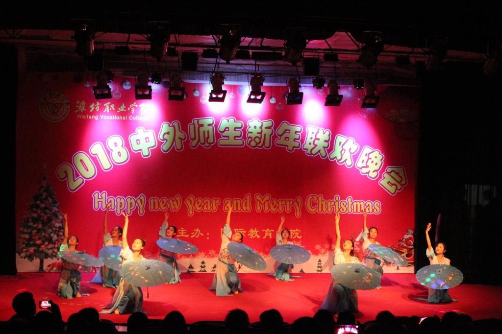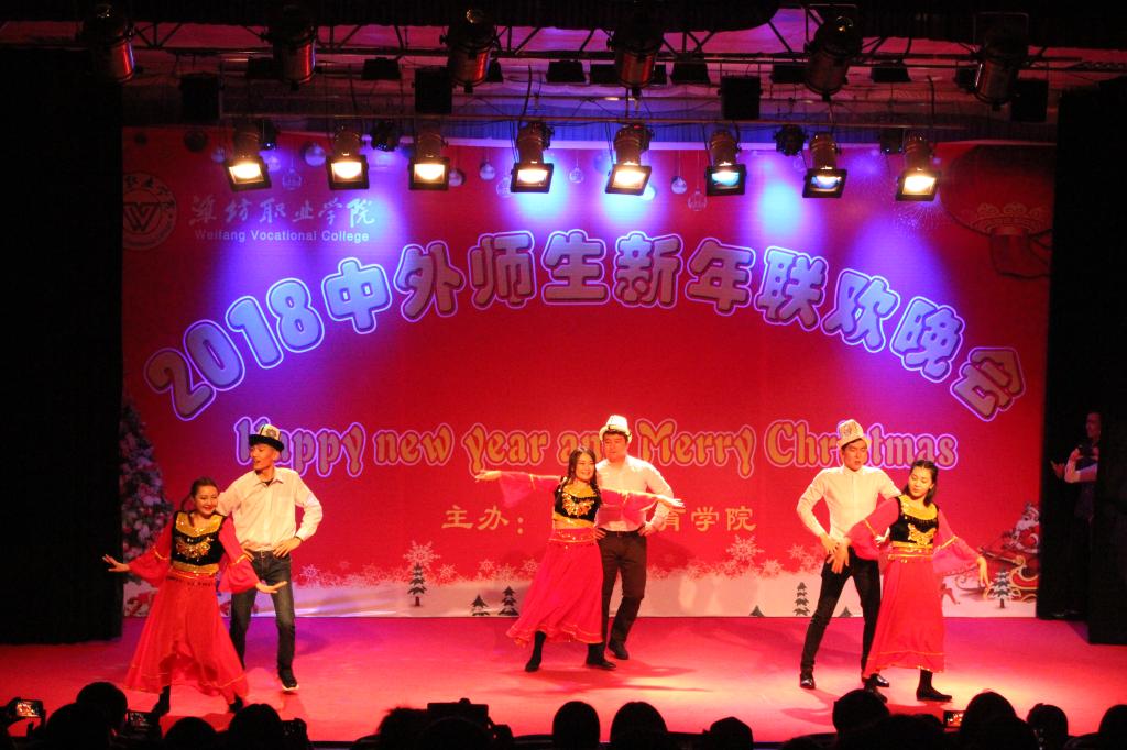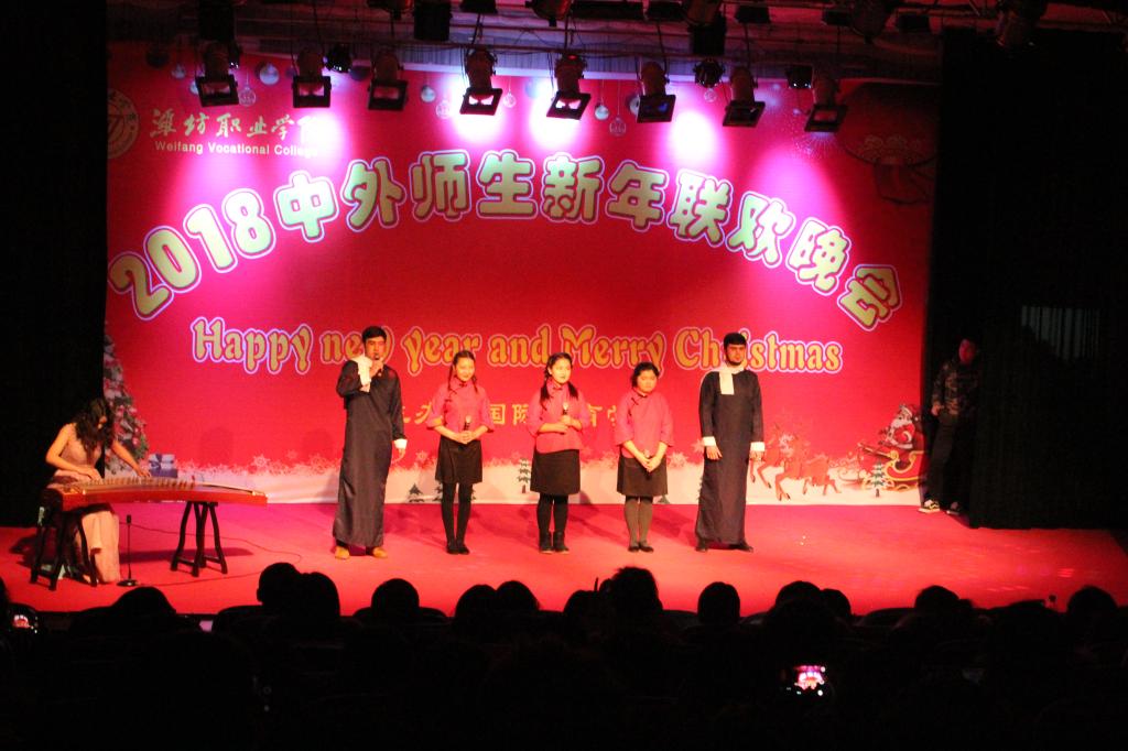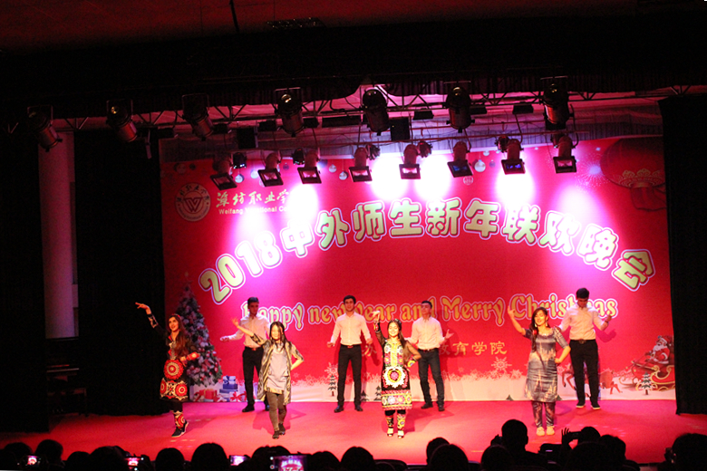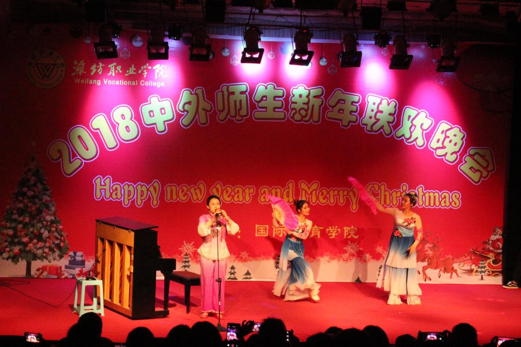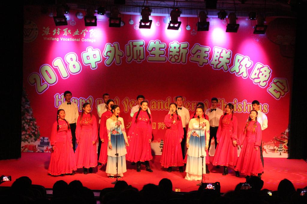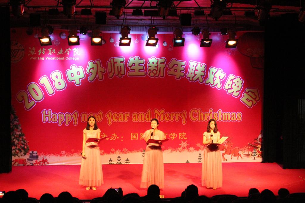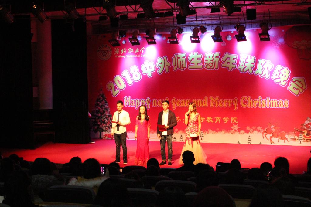 12月24日晚,MG冰球突破官网2018年中外师生新年联欢晚会在奎文校区报告厅举行。学院副院长赵君堂,相关部门、各二级学院负责同志与中外师生500余人欢聚一堂,共度平安夜,喜迎新年。