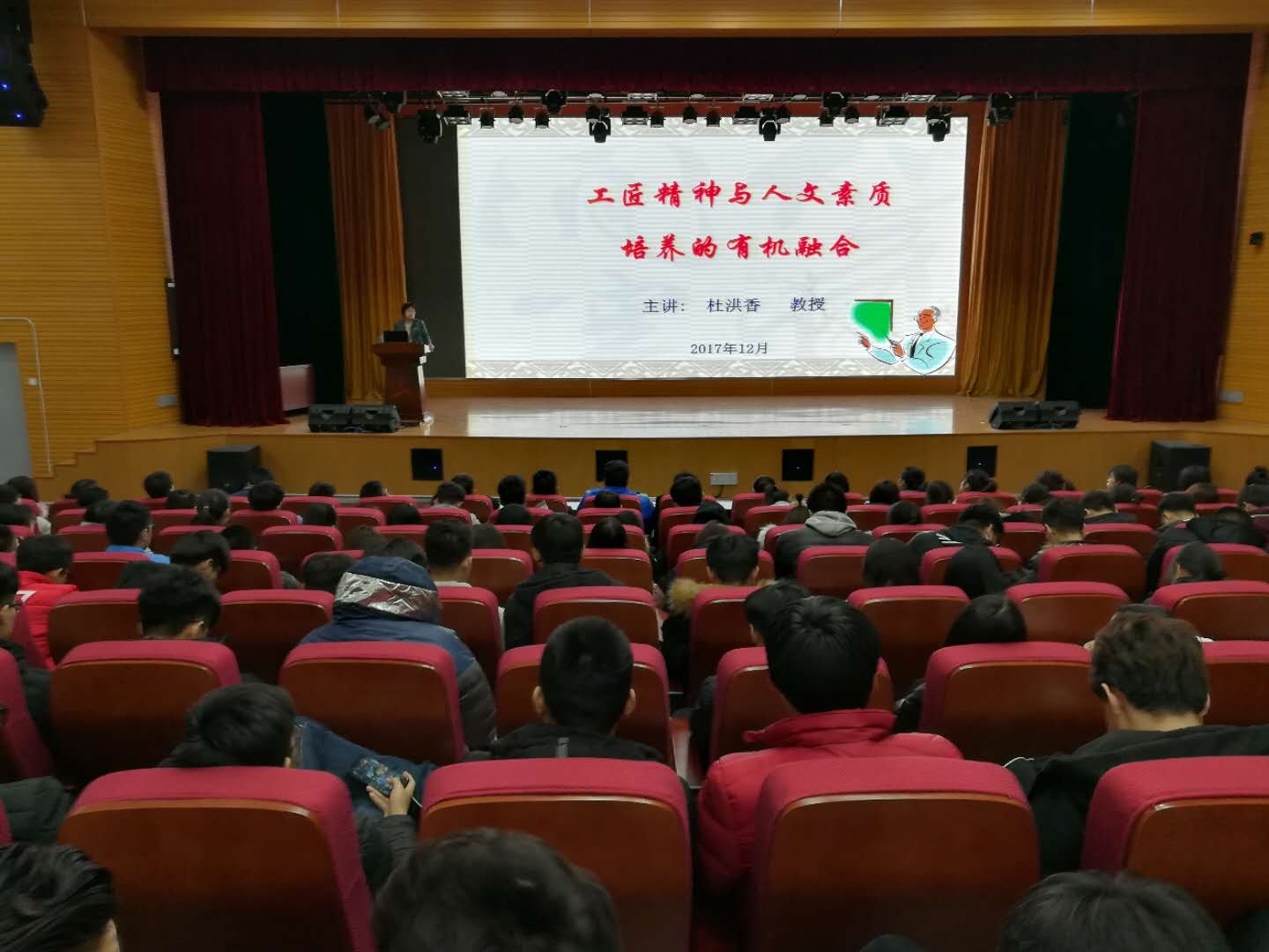 12月21日,学院第十场人文素养系列讲座在滨海校区图书馆报告厅举办,汽车工程学院院长杜洪香教授作了题为“工匠精神与人文素质培养的有机融合”报告,400余名学生聆听讲座。