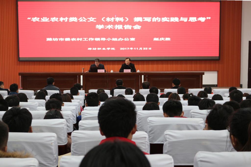 11月22日,MG冰球突破官网邀请潍坊市委农村工作领导小组办公室赵庆胜副调研员在清泽楼报告厅作“农业农村类公文(材料)撰写的实践与思考”学术报告,副院长贺志强主持报告会,各职能部门教师代表、二级学院分管产学研工作人员及学生代表300余人聆听了报告。