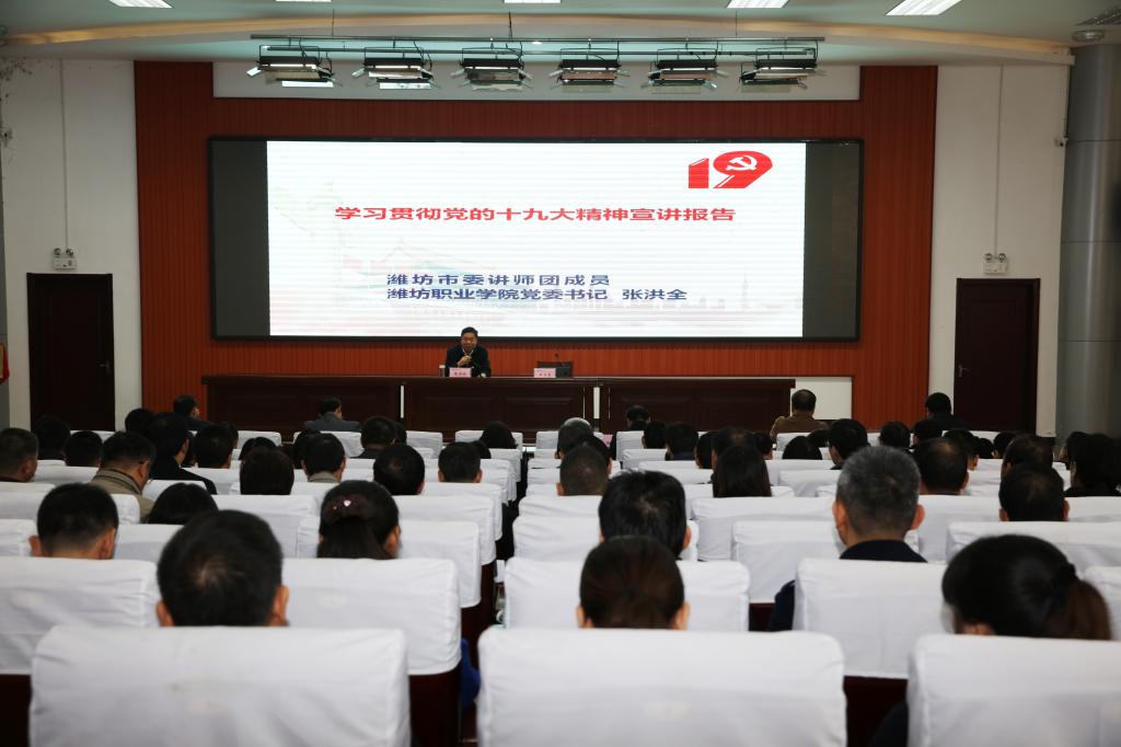 张洪全要求,学习宣传贯彻党的十九大精神,落实好习近平总书记提出学懂、弄通、做实的要求,扎实推动十九大精神在学院落地生根、开花结果。一是要全面贯彻党的教育方针,落实“立德树人”根本任务,为推动潍坊“四个城市”建设做出积极贡献;二是要全面落实全面从严治党,抓党建促创建,努力做好优质校建设和文明单位创建工作,为打造教育名城做出新贡献;三是要牢固树立新发展理念,以优质校创建为动力,以文明创建为抓手,以服务师生为根本,全面深化综合改革,推动内涵式发展,提升人才培养质量和办学水平,努力打造山东职业教育品牌,为区域经济社会发展做出更大的贡献。他希望,让我们更加紧密地团结在以习近平同志为核心的党中央周围,不忘初心,提振精神,主动作为,敢于担当,为建设“潍坊龙头、全省前列、国内知名、有国际影响”的现代化优质高职院校而努力奋斗。