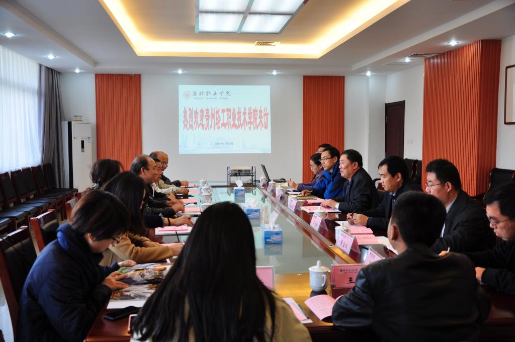 11月13日下午,贵州轻工职业技术学院副院长刘天德一行9人来MG冰球突破官网考察交流。学院党委副书记宋桂言在会议室会见客人。组织人事处、学生工作处、基建处、安全保卫处、食品药品学院、化学工程学院相关负责同志参加座谈。