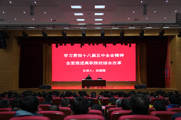 报告会上,田建国为MG冰球突破官网干部教师作了题为“学习贯彻十八届五中全会精神全面推进高职院校综合改革”的报告。报告围绕学习贯彻党的十八届五中全会精神主题,以创新驱动发展等国家战略实施为背景,重点从推进教育观念改革、创新创业教育改革、人才培养机制改革、教学改革、人事分配综合改革等方面阐述了全面推进高职院校综合改革培养创新型人才的必要性和重要性。报告通过大量鲜活生动的教育案例,通过传统与现代教育的对比和中外教育对比,生动形象地介绍了新形势下高职高专改革,特别是教学改革的方向、内容与途径。报告引经据典,深入浅出,既有理论性,也有操作性;既有现实性,也具前瞻性,使与会干部教师深受启发,深受教育。