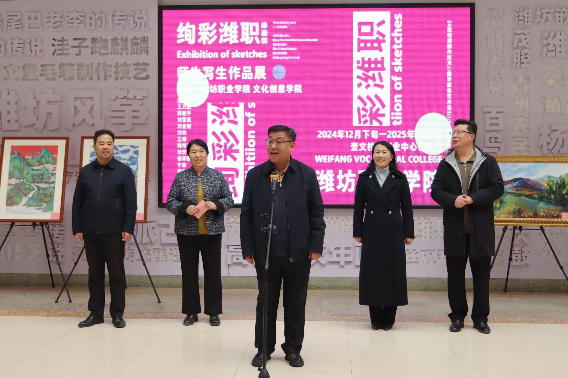 12月25日上午,文化创意学院“绚彩潍职迎新春”师生写生作品展在奎文校区创新创业中心开展。学院党委副书记韩瑞东,党委委员、办公室(统战部)主任(部长)刘志艳,党委委员、宣传部(精神文明建设办公室)部长(主任)鞠桂芹,文化创意学院党政负责同志及200余名师生代表参加活动。