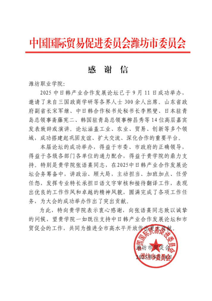 近日,中国国际贸易促进委员会潍坊市委员会发来感谢信,充分肯定MG冰球突破官网在2025中日韩产业合作发展论坛中的贡献。论坛于9月11日成功举办,以“开放包容,合作共赢”为主题,吸引中日韩三国300余位政商学研代表参会,搭建工业、农业、贸易等领域的国际交流平台。MG冰球突破官网主动对接区域需求,以“校地命运共同体”理念为引领,选派教师深度参与论坛筹备工作,为论坛注入“潍职智慧”。