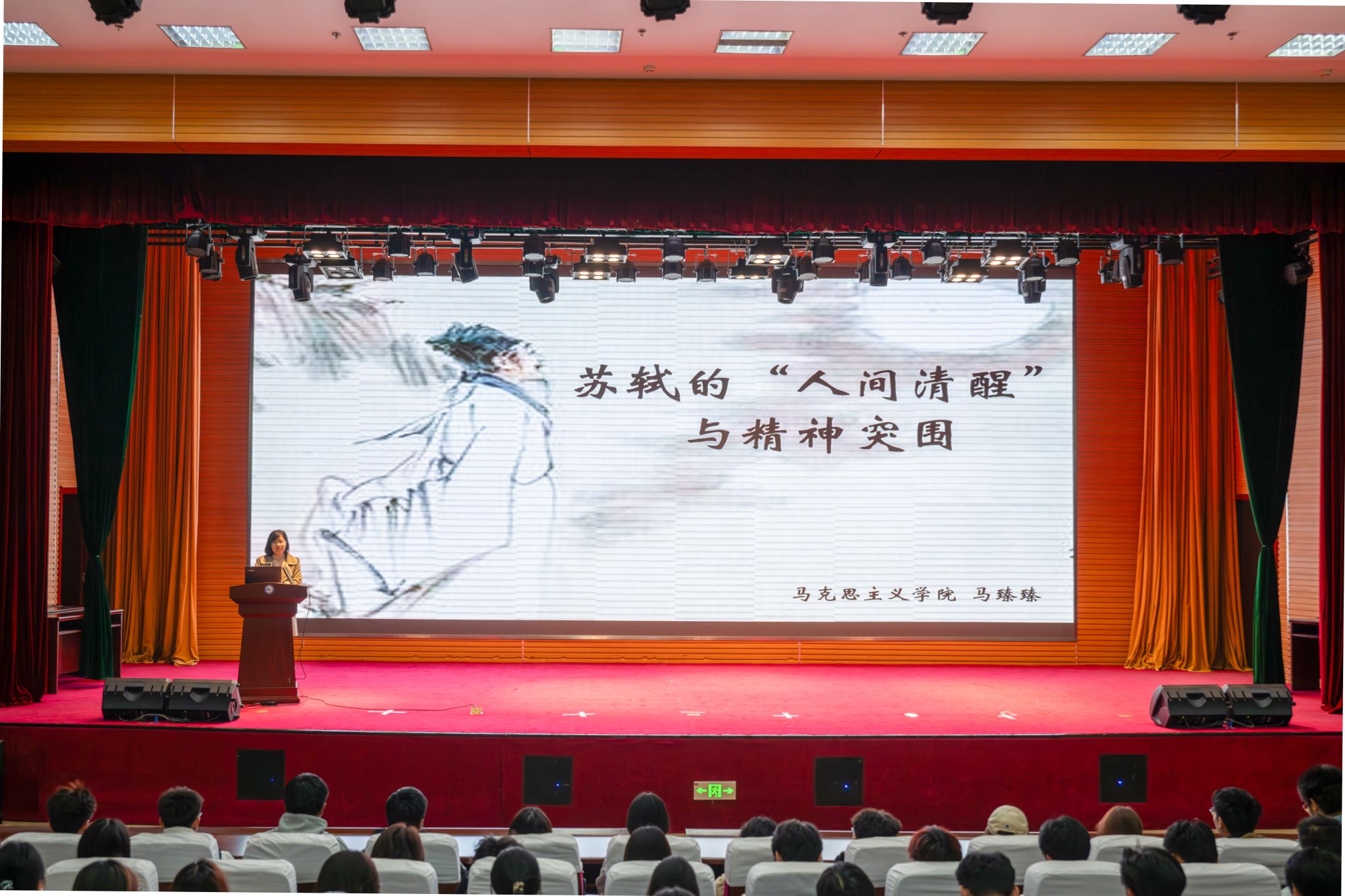 10月30日下午,学院第127场人文与思政讲座在滨海校区图书馆报告厅举行。马克思主义学院马臻臻老师作了题为“苏轼的‘人间清醒’与精神突围”的讲座。2025级400余名学生参加讲座。