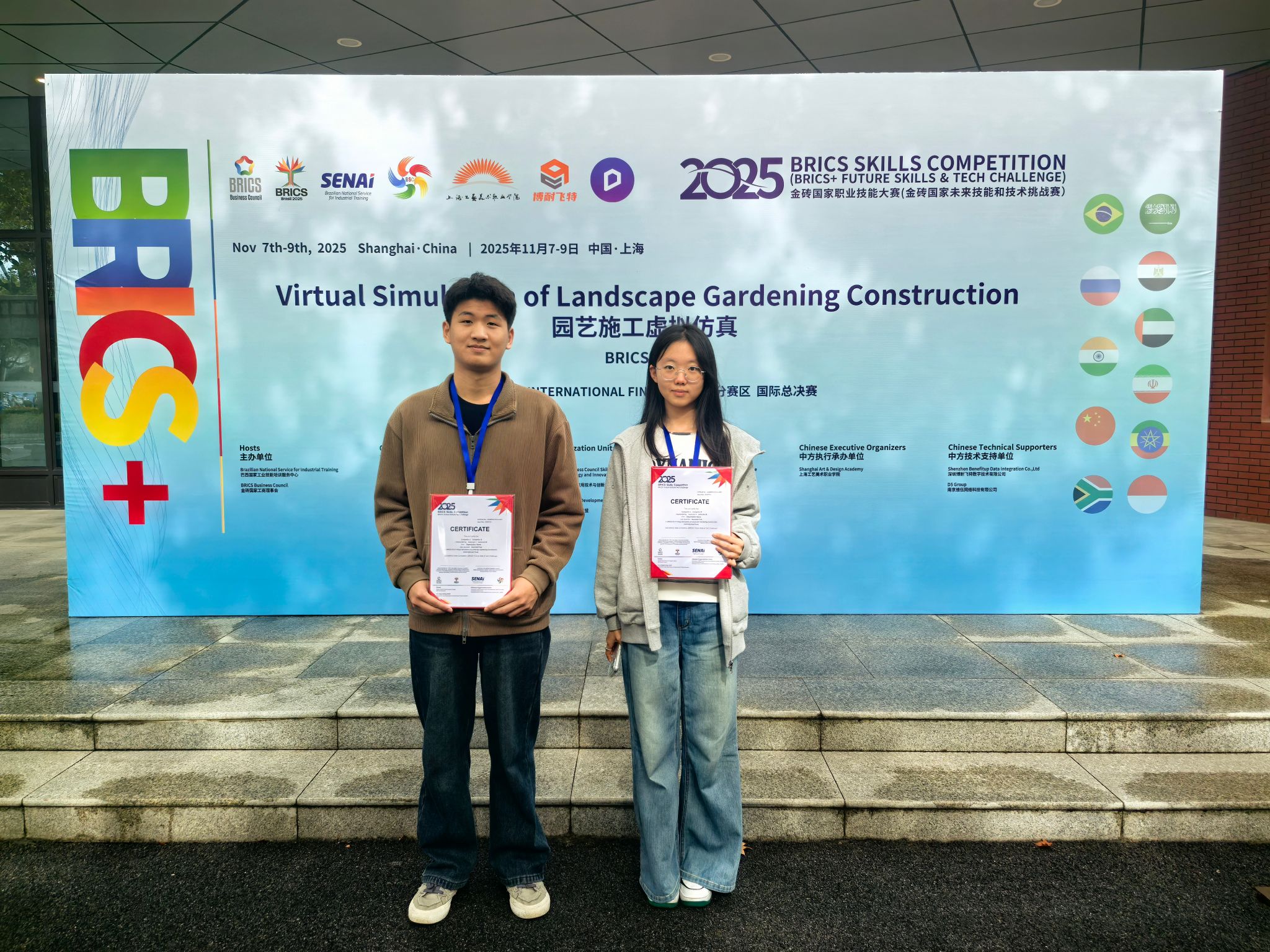 本次大赛由巴西国家工业技能培训服务中心 SENAI、金砖国家工商理事会联合主办,聚焦数字经济、新技术等重点领域,旨在搭建金砖 + 国家职业教育交流平台,培养国际化高质量技术技能人才。学院高度重视此次参赛工作,接到赛事通知后,迅速组建专项指导团队,制定系统集训方案。参赛团队结合赛事标准,从虚拟仿真操作、方案设计、团队协作等多个维度开展针对性训练。比赛现场,两位选手沉着冷静、配合默契,熟练运用专业知识完成虚拟园艺施工全流程操作,赢得了裁判组的高度认可。