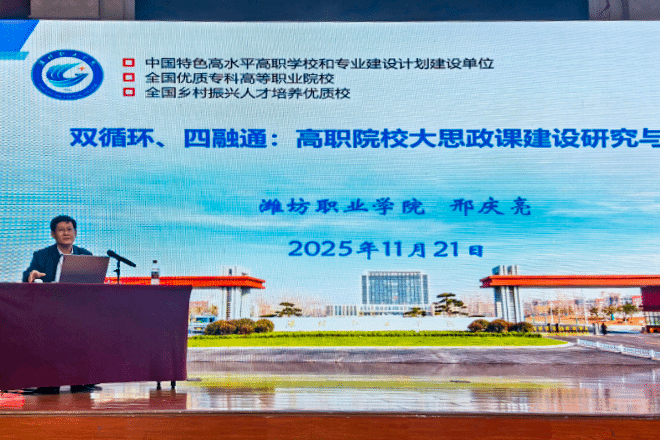 本次年会由山东省老教授协会、山东省高职高专院校思政课建设联盟主办,山东电子职业技术学院承办。年会内容丰富,涵盖了专家报告、经验交流、思政课示范展示以及专业群课程思政研课等多个环节,旨在共同探讨思政课程与课程思政的改革创新路径,携手绘制“大思政课”育人新蓝图。期间召开了山东省高职高专院校思政课建设联盟理事会。在经验交流环节,5位马克思主义学院院长及骨干教师代表就大思政课建设及中高职思政课一体化改革创新作了典型发言。MG冰球突破官网马克思主义学院邢庆亮教授以《双循环、四融通:高职院校大思政课建设研究与实践》为题进行了汇报交流,得到与会专家教师高度评价。