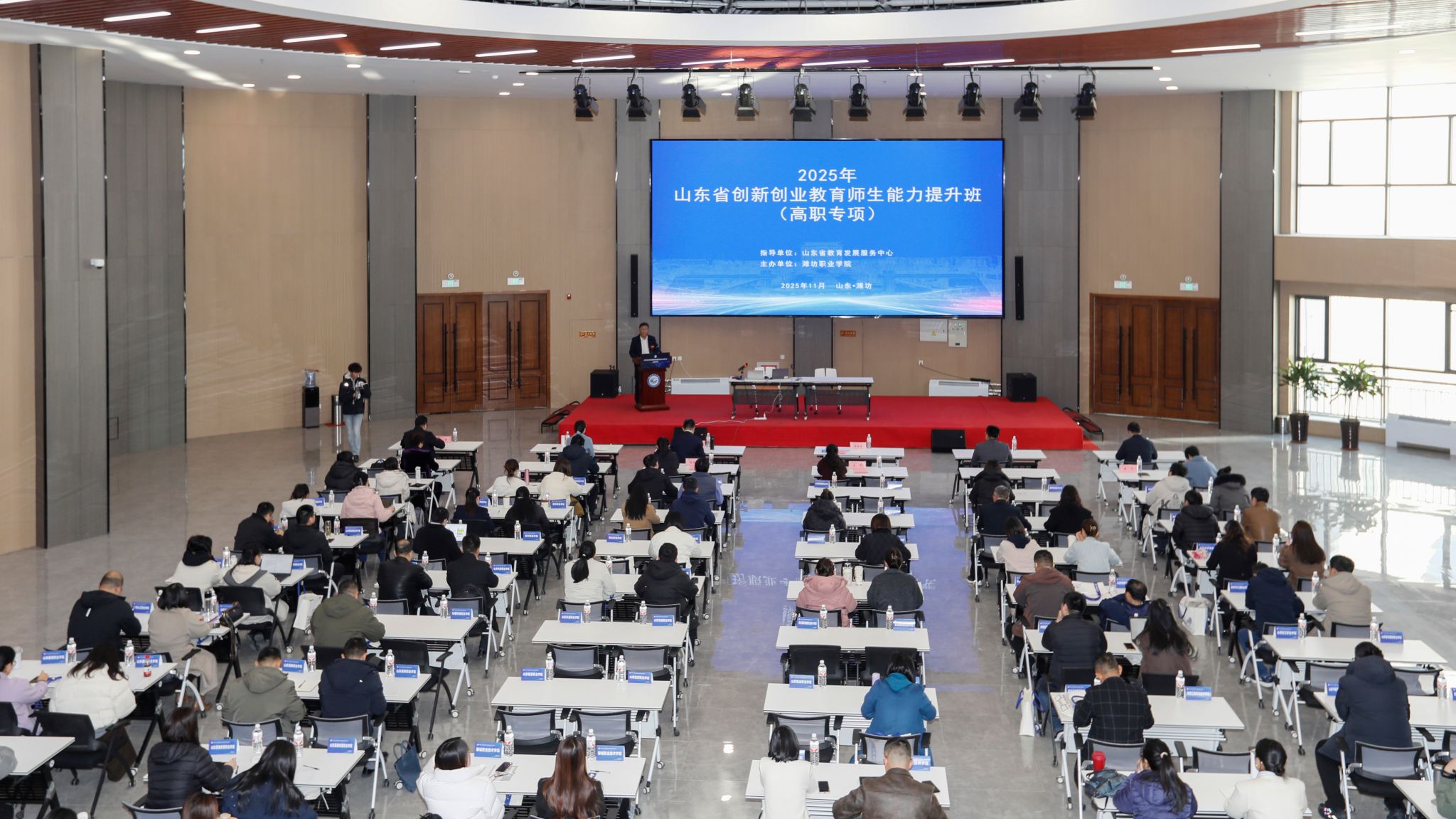 11月26日至29日,2025年山东省创新创业教育师生能力提升培训班在MG冰球突破官网举办。山东省教育发展服务中心党委书记、主任魏光祥,山东省教育厅职业教育处副处长钟京志,山东省教育发展服务中心党委委员、副主任孙培东以及就创工作部全体同志到校指导,学院院长韩瑞东,副院长陈美霞出席。培训班开班仪式由魏光祥主持,韩瑞东、钟京志分别致辞,来自省内47所职业院校的120余名学员参加培训。