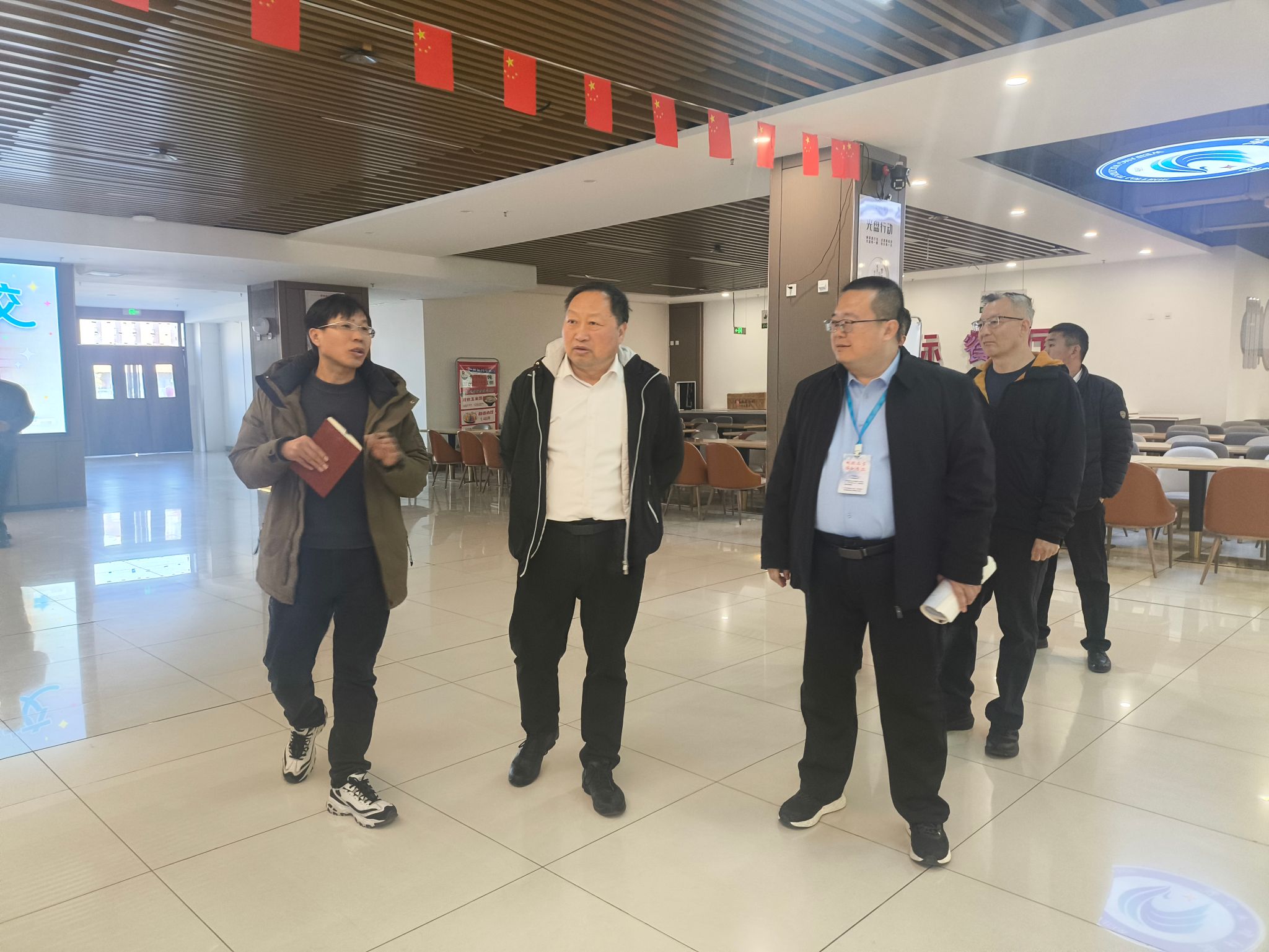 付一明带队先后前往实训车间、教学楼、学生公寓、学生餐厅、教工餐厅、校园超市、快递服务站点及校园公共区域,实地查看后勤各环节运行情况,重点关注开学准备、服务保障、安全管理等工作落实成效。