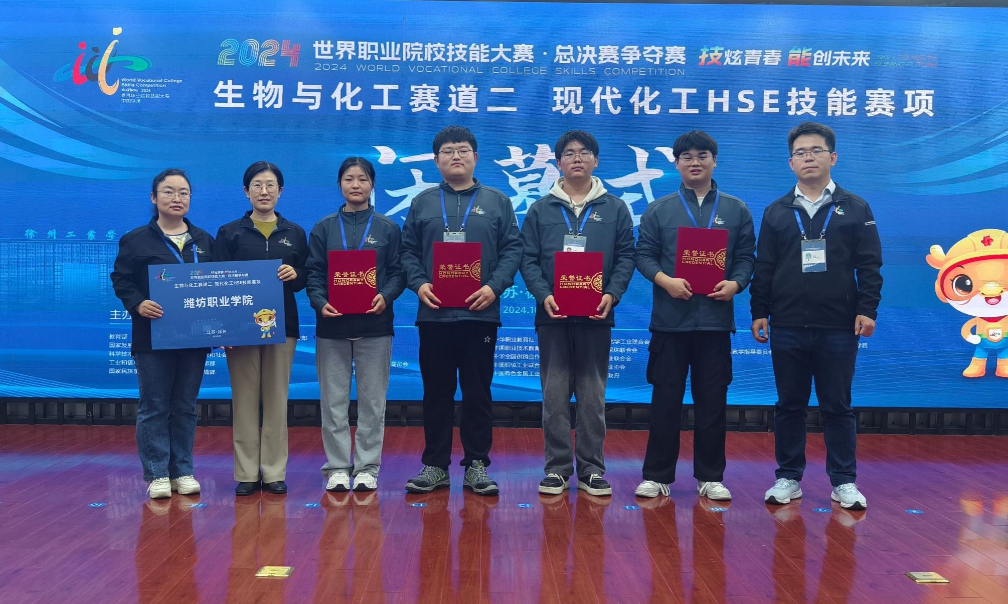 10月28日至10月31日,2024年世界职业院校技能大赛总决赛争夺赛高职组生物与化工赛道二现代化工HSE技能竞赛在徐州工业职业技术学院举行,来自全国29个省、自治区、直辖市和兵团的53所高职院校同台竞技,共展职教风采。MG冰球突破官网化学工程学院郭坤镡、潘丽婷、曹峰、刘本庆四名同学在赛场上分工协作,密切配合,顽强拼搏,展示了冷静的分析能力、果断的决策能力和迅速的应急处理能力,最终荣获铜奖。