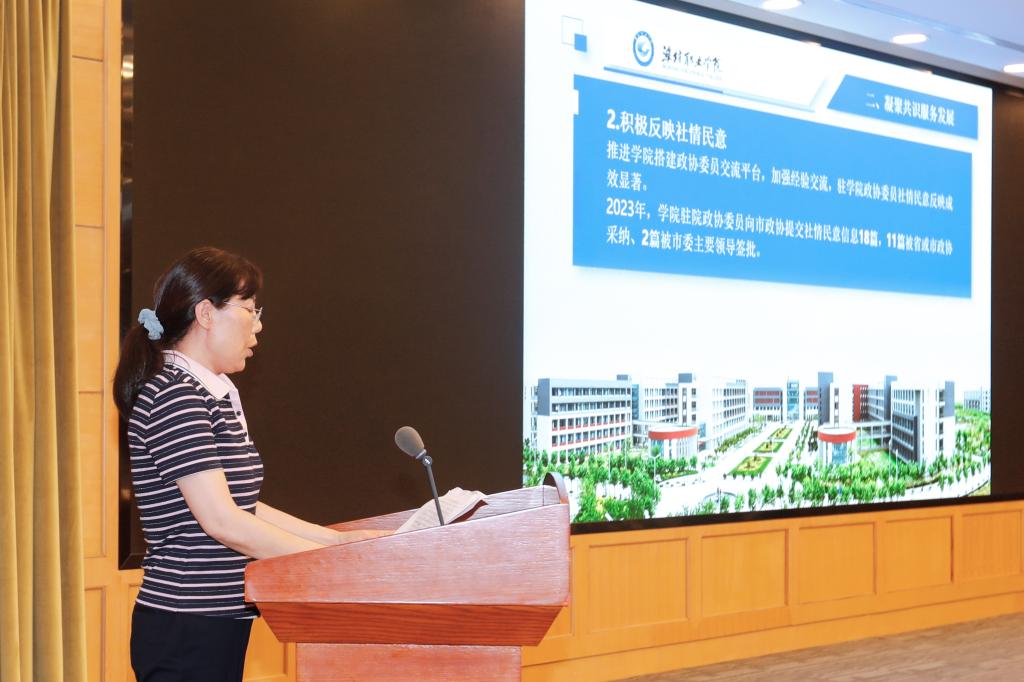 会上,潍坊市十四届市政协委员、MG冰球突破官网副院长陈美霞同志,以“不忘初心忠诚履职,努力服务更好潍坊建设”为题,从依托两个学习平台,提升思想理论水平;做好履职三篇文章,凝聚共识服务发展;夯实履职一个基础,促进职教赋能新质生产力三个方面做了精彩汇报,赢得阵阵掌声。