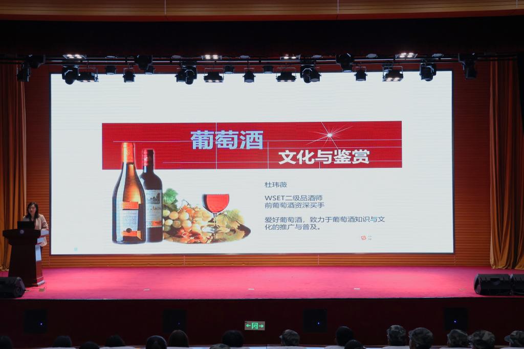 杜玮薇老师是国际葡萄酒与烈酒(WSET)二级品酒师。讲座从葡萄酒的起源讲起,讲述了葡萄酒文化在西方的发展、葡萄酒文化在中国的发展情况和葡萄酒方面的一些必备小知识。在讲解西方葡萄酒文化时,重点介绍了如何利用酒标识别葡萄酒的价值以及Terroir(风土)对葡萄酒品质的影响,引导同学们认识葡萄酒,树立正确的消费观念。从贾湖遗址出土的陶器上发现酒石酸到张骞出使西域带回葡萄酒酿酒技术,从唐朝诗人王翰的“葡萄美酒夜光杯,欲饮琵琶马上催”到宋代词人苏轼的“认得岷峨春雪浪,初来,万顷葡萄涨渌醅”,从近代张弼士先生在山东烟台创办张裕酿酒公司实业救国到张裕解百纳在“全球葡萄酒畅销大单品盲品赛”上夺冠,主讲人给大家展现了葡萄酒文化在中国发展的优美画卷,引导同学们树立文化自信。讲座的最后主讲人简要介绍了如何识别葡萄酒和如何品酒,并告诫同学们要适度饮酒,健康生活。