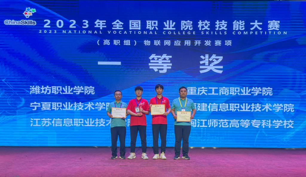 9月12日,2023年全国职业院校技能大赛高职组“物联网应用开发”赛项在宁夏职业技术学院举办,来自全国59个代表队参加角逐。MG冰球突破官网学生贾天乐、王松波组成的代表队,在指导教师团队徐希炜、昌厚峰、张卫荣、孙晓东带领下以第一名的优异成绩获得团体一等奖,指导教师徐希炜、昌厚峰获评“优秀指导教师”。