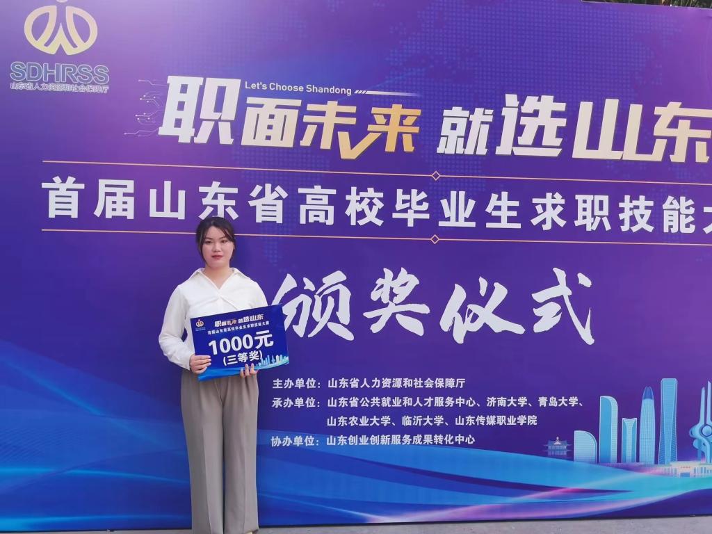 近日,由山东省人力资源和社会保障厅主办的“职面未来 就选山东”首届山东省高校毕业生求职技能大赛在济南圆满落下帷幕。经过学院初赛选拔推荐、省级复赛、决赛的激烈角逐,MG冰球突破官网文化创意学院2023届毕业生李冰然一路披荆斩棘,脱颖而出,荣获三等奖。MG冰球突破官网获“优秀组织奖”。