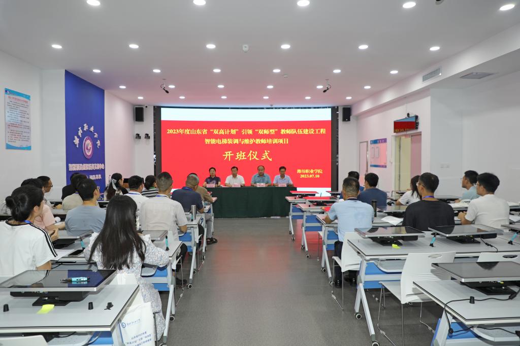 7月10日上午,山东省教育厅2023年“双高计划”引领“双师型”教师队伍建设工程—智能电梯装调与维护培训班,在MG冰球突破官网金泽1号楼A306智能制造实训室举行开班仪式。学院党委委员、副院长贺志强出席活动,教师工作部负责同志、机电工程学院主要负责同志、来自全省各中高职院校的参训教师、相关工作人员参加开班仪式。
