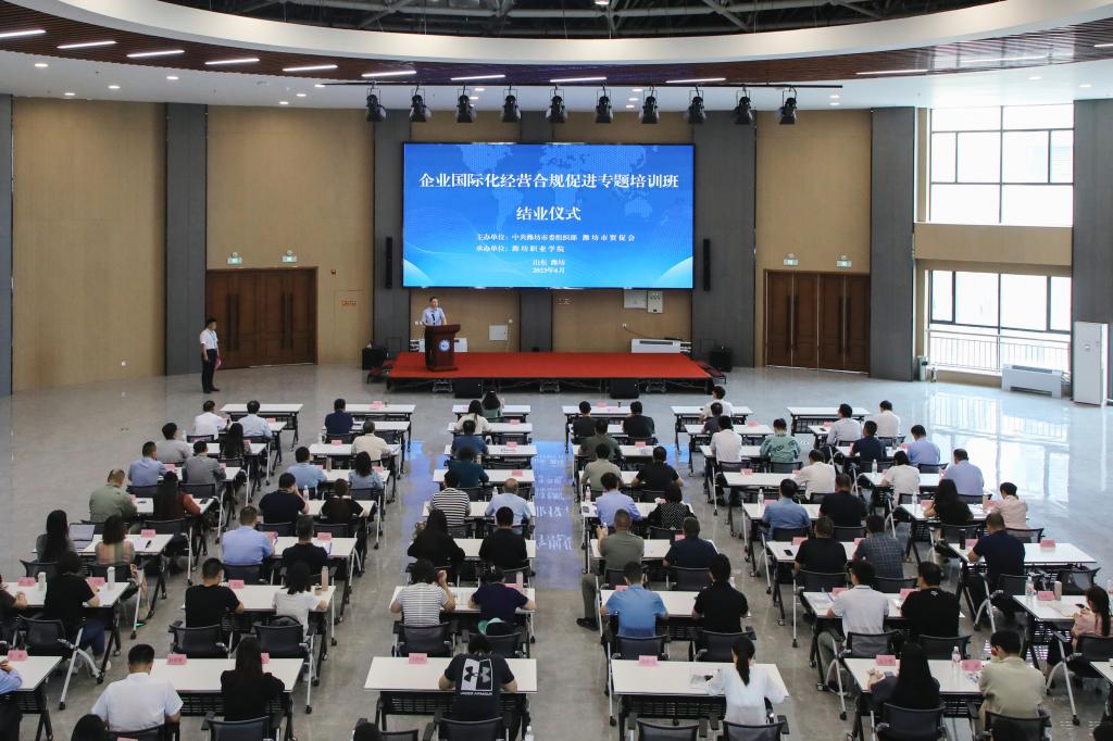 6月2日下午,由中共潍坊市委组织部、潍坊市贸促会主办,MG冰球突破官网承办的“企业国际化经营合规促进专题培训班”在学院国际学术交流中心二楼报告厅举行结业仪式。潍坊市贸促会党组书记、会长胡文星,学院副院长陈美霞出席仪式,全体培训学员参加仪式。