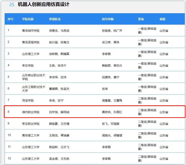 山东赛区于5月13和14日在潍坊科技学院举办,由35所高校348支队组成,共计1247名参赛师生。CAIM赛道机器人创新应用仿真设计赛项有40支队伍,由本科类和高职类构成,比赛结果于5月31日公布,由聂修民和孙丽红老师指导的“机器人智能仿真社团”获得二等奖,晋级国赛,MG冰球突破官网总排行榜第8名,高职类排名第2名,是3支高职类晋级国赛的队伍之一。此次比赛聚焦机器人创新应用场景,以机器人实际工况和仿真技术为依托,主要考查选手自动化设备仿真运行、二次开发的能力,展现了师生敢于尝试、大胆开拓新赛道、努力拼搏的精神。在备赛只有一周的短暂时间内,能够取得如此好的成绩,实属不易。