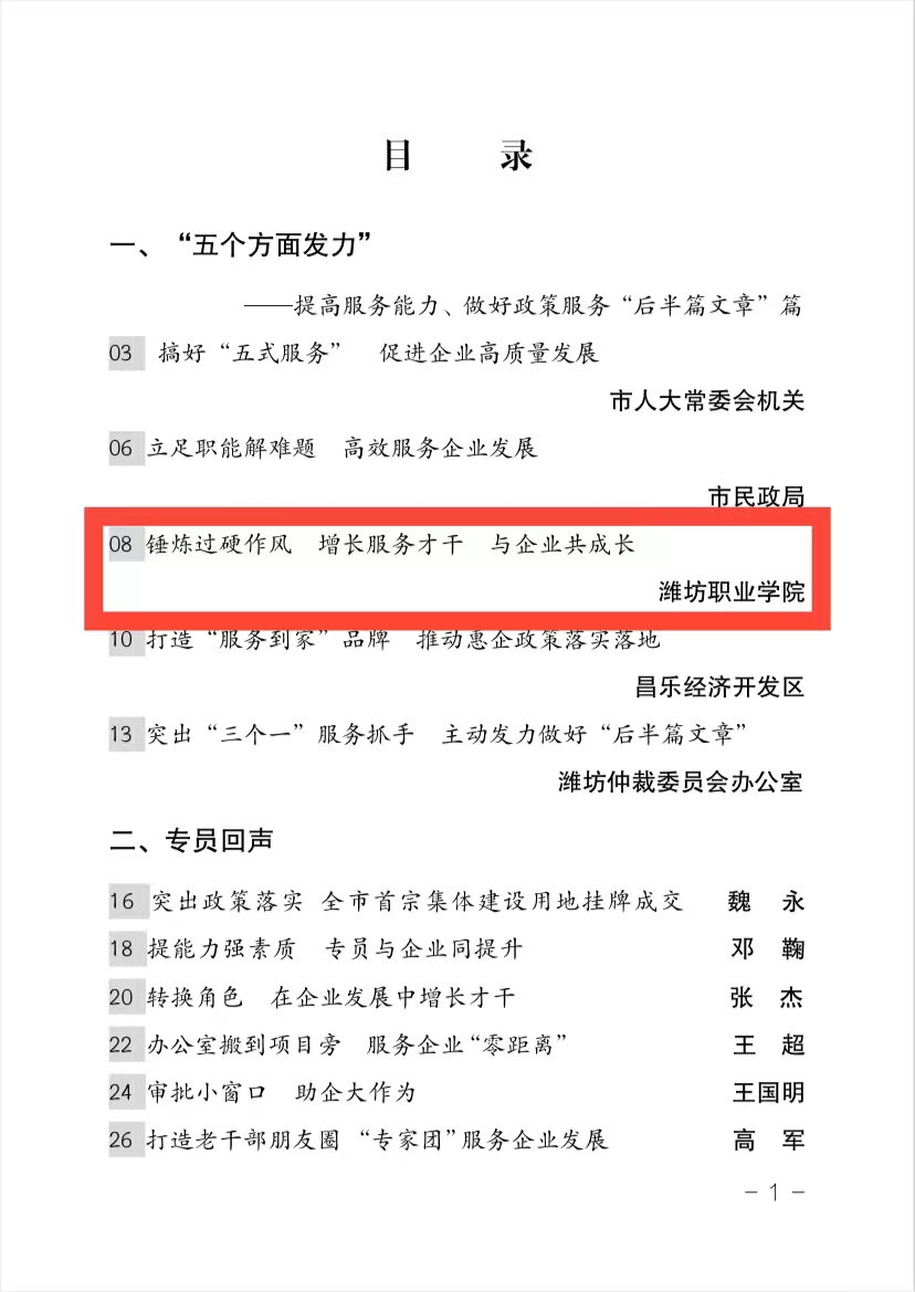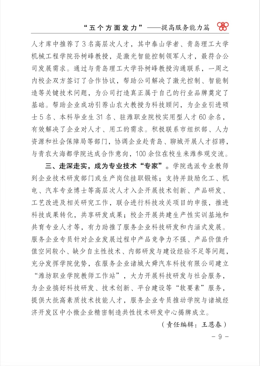 学院高度重视企业服务工作,认真落实市委市政府推行服务企业专员制度的决策部署,扎实开展服务企业发展工作,积极协调解决服务过程中出现的困难及问题。学院43名服务企业专员服务诸城经济开发区、高新区88家企业,2021年共收集问题210项,问题提报率488.37%,问题完成率100%。对企业提出的引进高端人才、用工问题、资金问题、土地指标等问题进行了解决,为企业的发展提供了助力。