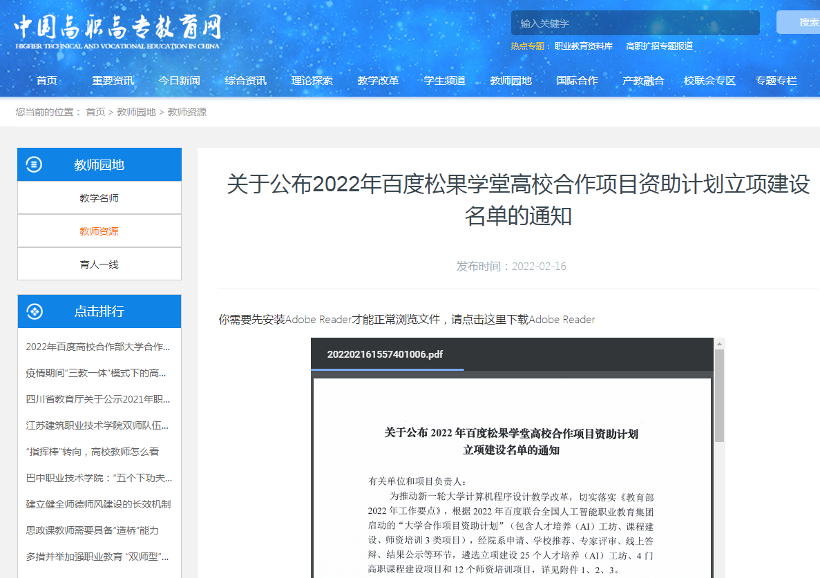 近日,中国高职高专教育网发布了“关于公布2022年百度松果学堂高校合作项目资助计划立项建设名单的通知”,MG冰球突破官网入选全国首批百度松果人才培养(AI)工坊立项建设单位。