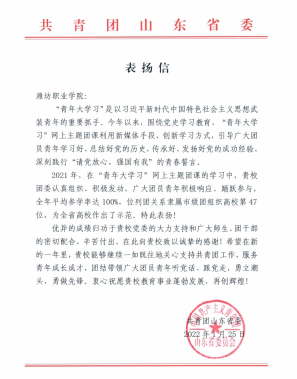 近日,学院收到共青团山东省委发来的表扬信,对MG冰球突破官网2021年度“青年大学习”网上主题团课学习中取得的优异成绩进行表扬。