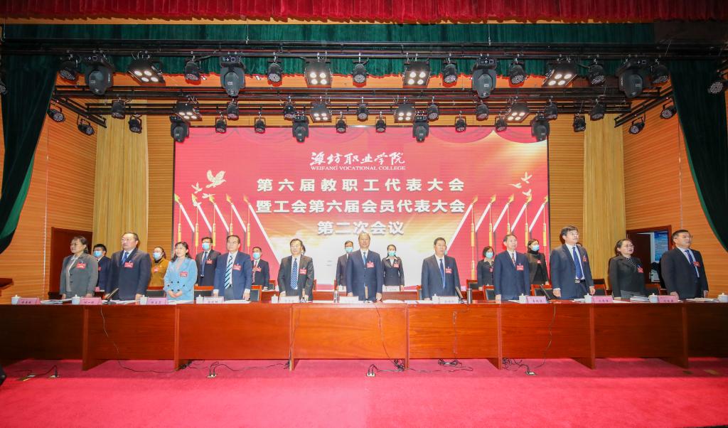 在雄壮的《国际歌》中,学院第六届教职工代表大会暨工会第六届会员代表大会第二次会议胜利闭幕。(鞠发营供稿)