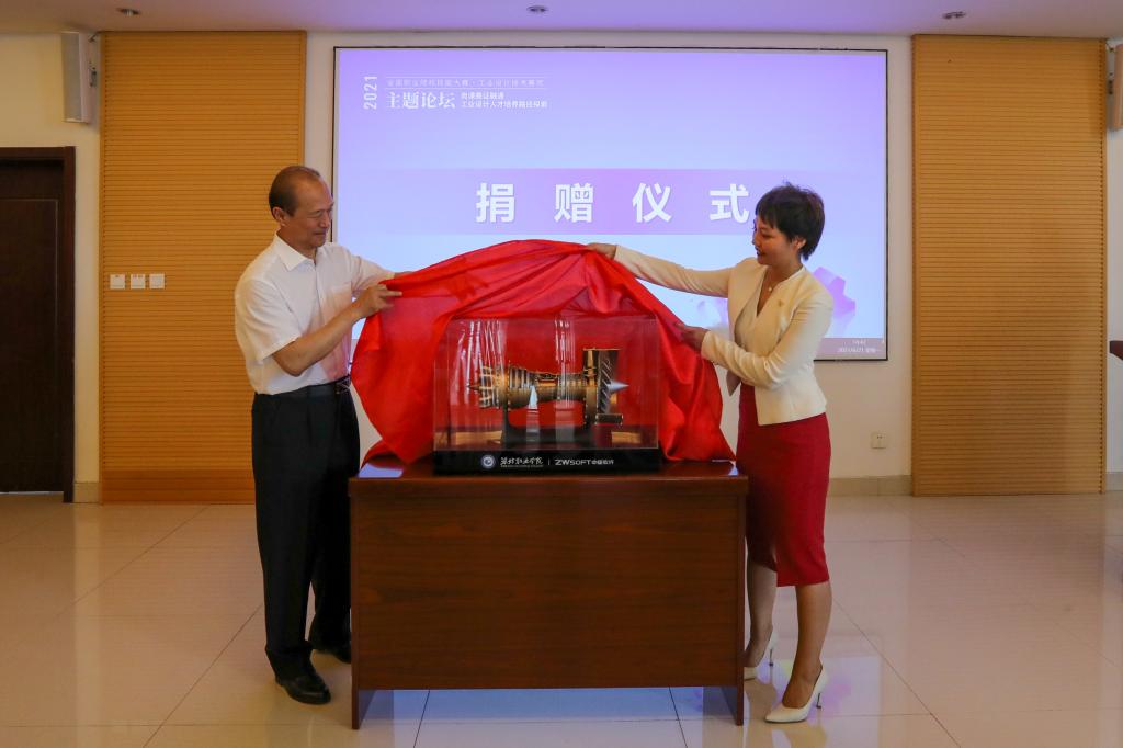 刘莉向我校捐赠了由中望软件公司自主研发的国产软件及3D打印设备打印组装的飞机发动机模型。