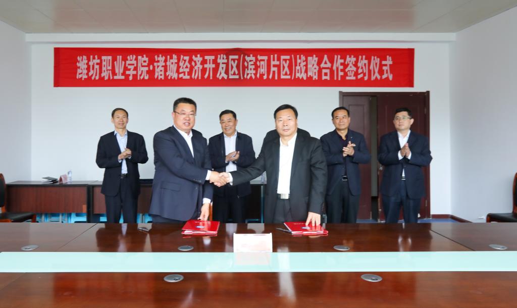5月9日上午,学校与诸城经济开发区管理委员会签署战略合作协议。诸城市人大主任赵治国,诸城市人大办公室秘书长高彦青,诸城市经济开发区滨河片区领导小组组长孙湘海,诸城市工信局副局长秦国华,诸城市经济开发区滨河片区领导小组成员杨华、祝立邦,学校党委副书记宋桂言,副校长贺志强、李瑞昌,纪委书记郭晓辉和部分服务企业代表参加签约仪式。