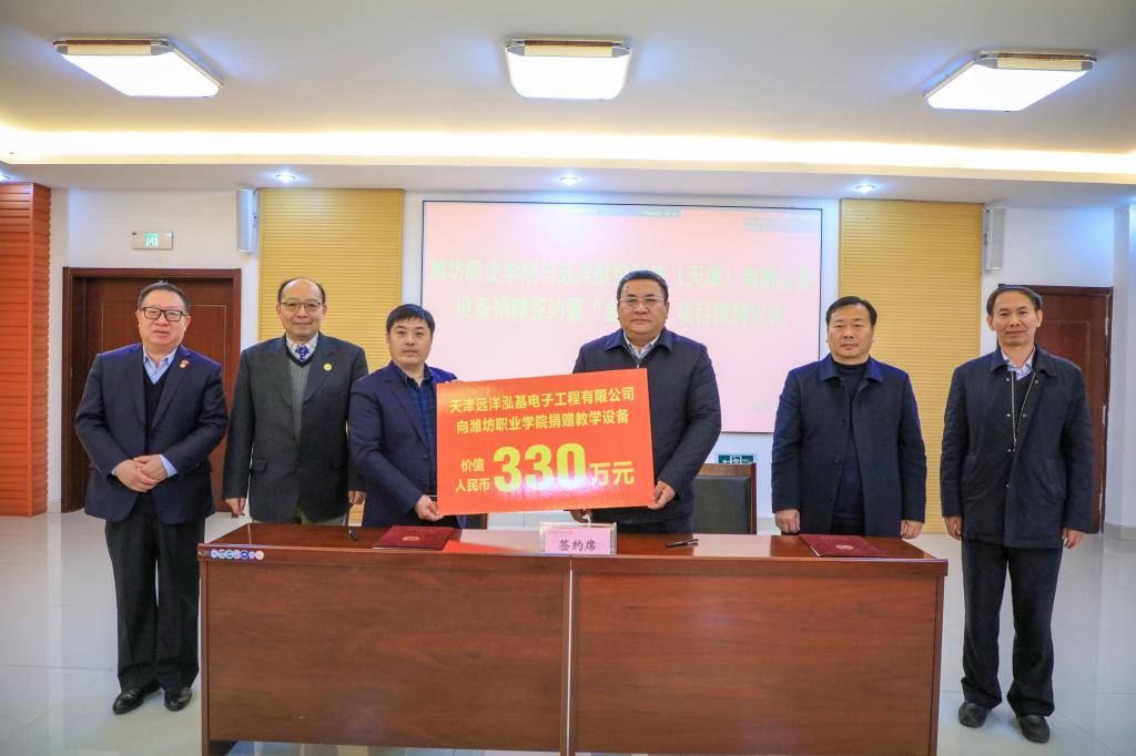 王家爱代表学院与远洋航空科技(天津)有限公司董事长张毅共同签署了《MG冰球突破官网与远洋航空科技(天津)有限公司捐赠协议》,并接受远洋航空科技(天津)有限公司捐赠的价值330万元教学设备。