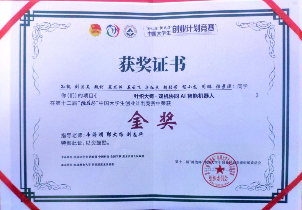 12月9日,第十二届“挑战杯”中国大学生创业计划竞赛全国决赛在东北林业大学落下帷幕,MG冰球突破官网孙凯等同学的“针织大师-双机协同AI智能机器人”项目荣获金奖,孟娇等同学的“大自然的化妆师”项目荣获银奖。学院同时获得“挑战杯”全国优胜杯,全国仅10所高职院校获此殊荣,是二十多年来山东省唯一获得“挑战杯”中国大学生创业计划竞赛金奖的高职学校。辛海明、郭大路等老师荣获全国优秀指导老师奖。