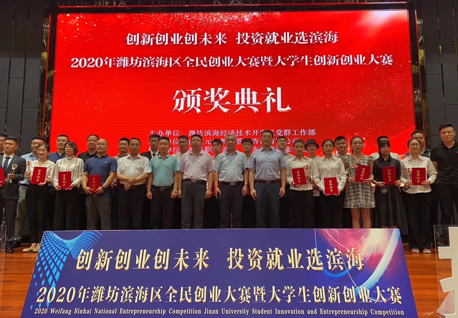 8月14日,2020年潍坊市滨海区全民创业大赛暨大学生创新创业大赛决赛在潍坊滨海城市艺术中心举行。大赛邀请省内知名投资人和创新创业导师作为评委,学院招生就业处(创业教育学院)主要负责同志出席决赛和颁奖典礼。
