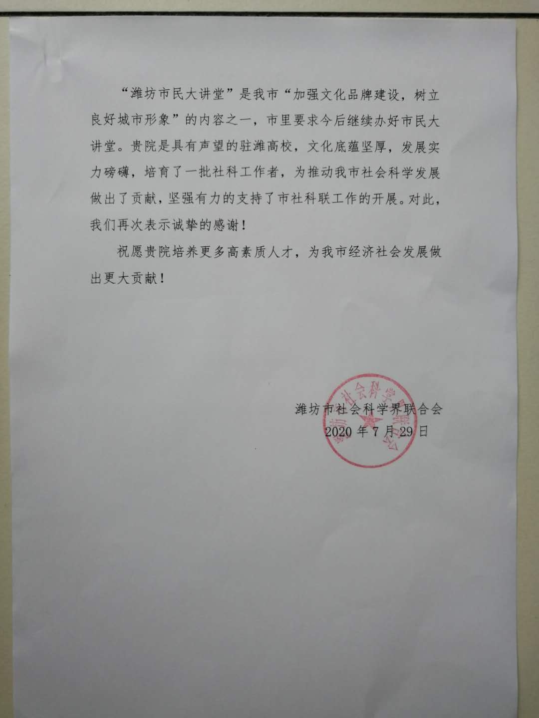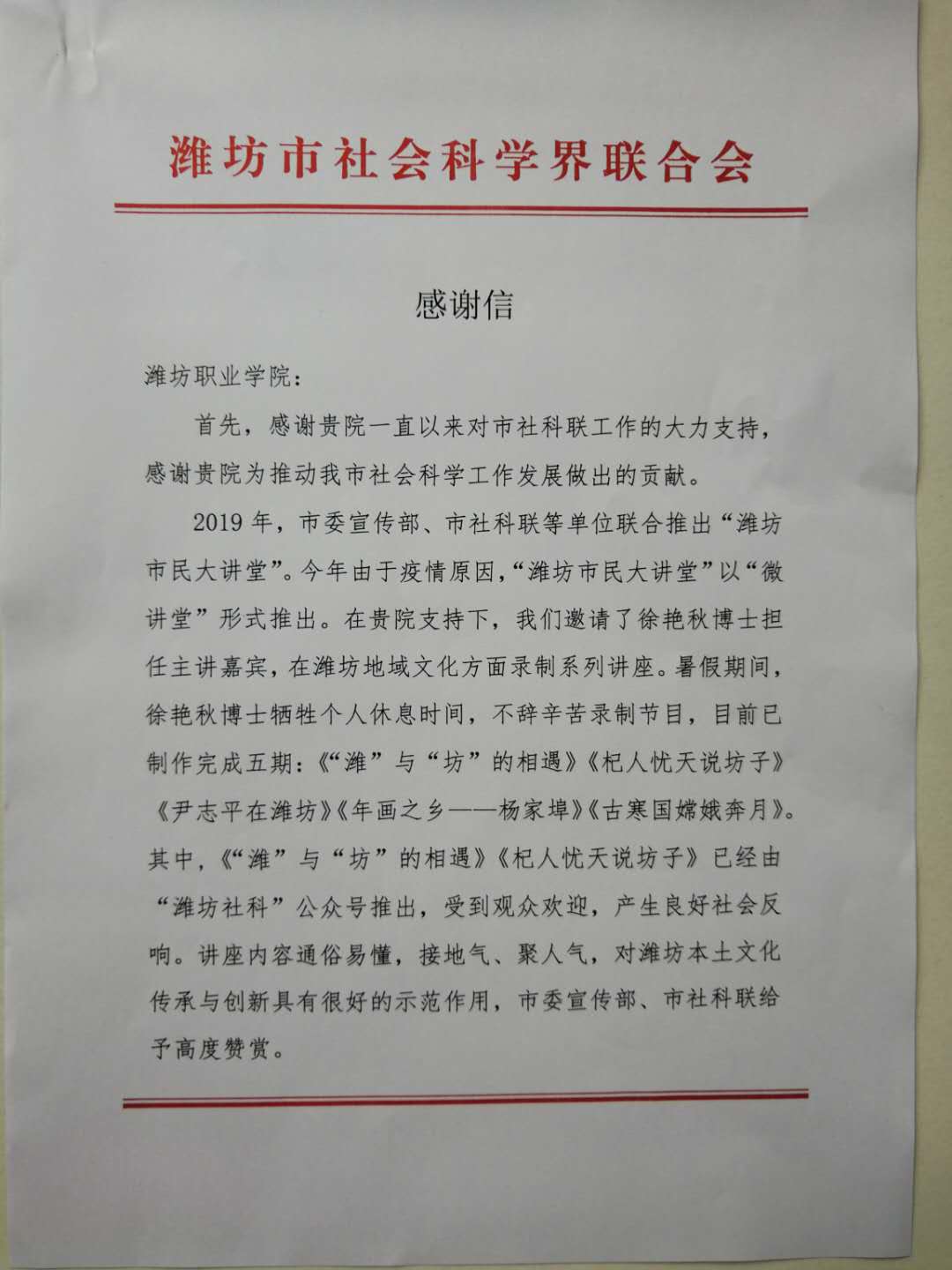 近日,学院收到潍坊市社会科学界联合会发来的感谢信,信中对MG冰球突破官网对市社科联工作的大力支持表示感谢,并对MG冰球突破官网徐艳秋博士参加“潍坊市民大讲堂”活动给予高度赞赏。