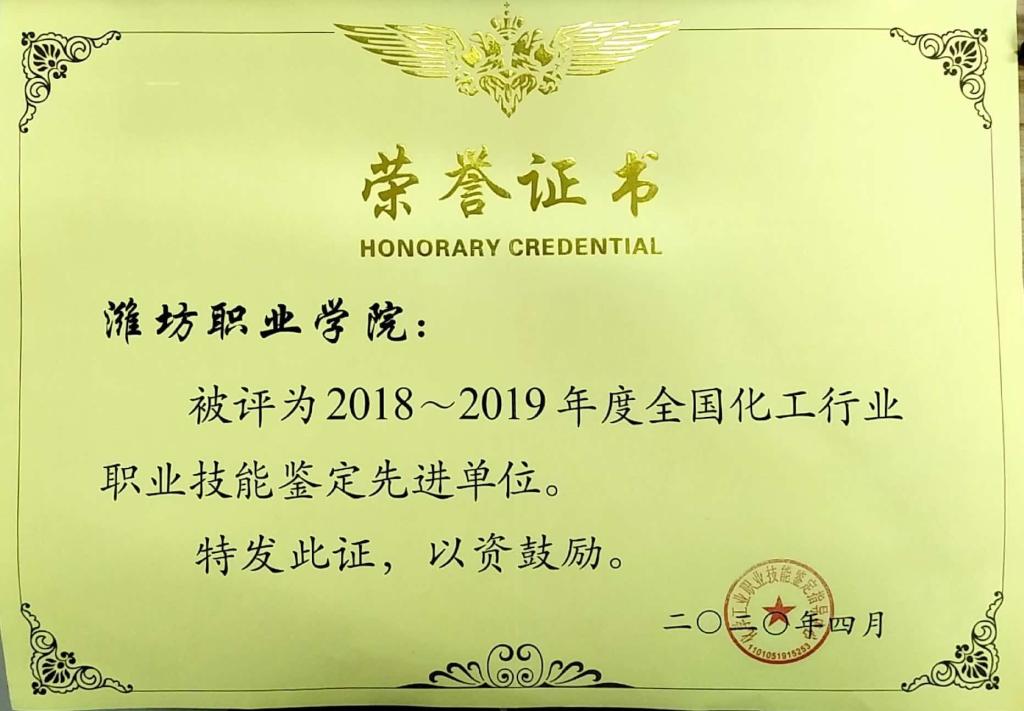 近日,国家化学工业职业技能鉴定指导中心发布2018-2019年度鉴定先进单位和先进个人表彰文件,MG冰球突破官网化工行业特有工种职业技能鉴定站荣获全国化工行业职业技能鉴定先进单位,邹芳、张新文两位教师被评为全国化工行业职业技能鉴定工作先进个人。