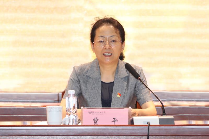 贾平致辞,对学院近年来取得的成就表示祝贺和赞许,对学院召开第六届教职工代表大会暨工会第六届会员代表大会第一次会议表示祝贺,并希望学院积极对接区域经济发展,深化教育教学改革,高质量推进学院建设,为潍坊经济发展和建设培养更多高素质技术技能人才。