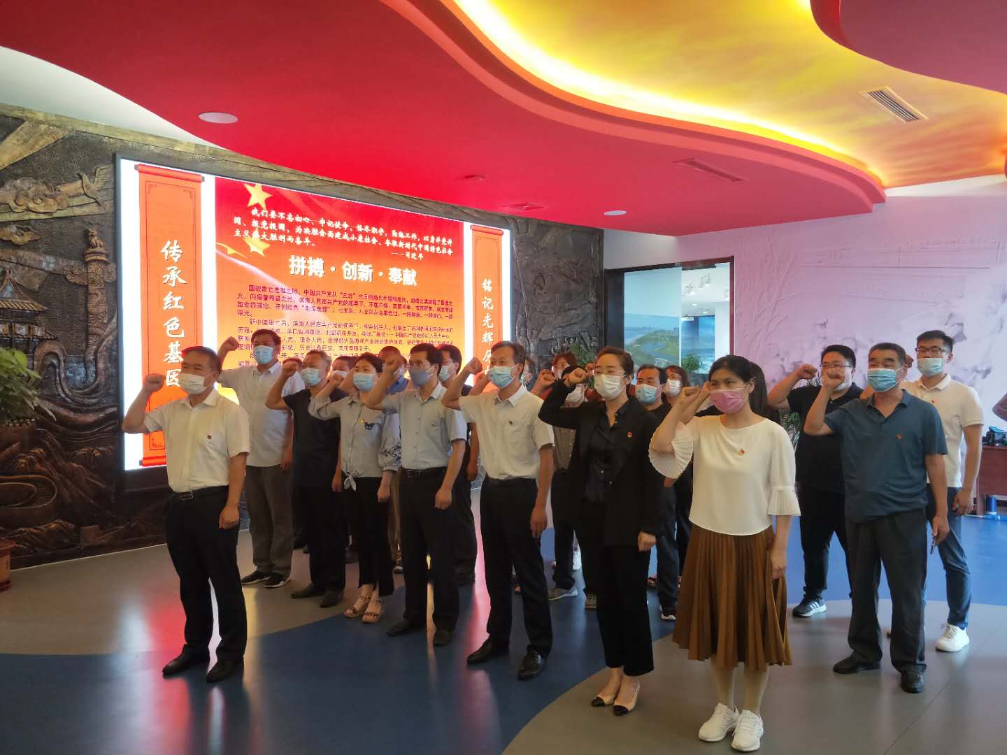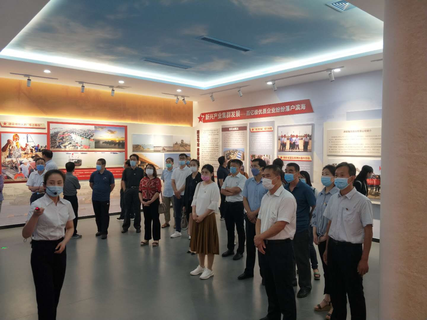 在展馆序厅,面对中国共产党党旗,郭晓辉带领全体党员一起高举右手,再次庄严宣誓,重温入党誓词,激励广大党员坚定理想信念,不忘初心、牢记使命,增强党组织的凝聚力和战斗力。在“拼搏、奉献”主题展馆,全体党员、入党积极分子在讲解员的讲解下参观了“烽火滨海、红色传承”“战天斗地、奋发图强”“转型升级、扬帆起航”“锐意进取、追求卓越”等四大主题展区,以滨海红色历史为起始,沿着新中国成立前老党员的初心,寻着英雄烈士的鲜血,以时间年轮为轴线,深刻感受滨海红色文化,在滨海历史故事和滨海盐碱滩蝶变新城的伟大变迁中激发爱国热情、弘扬民族精神、传承红色基因。参加主题党日的全体党员们还在融“教育、警示、体检、唤醒”为一体的党性教育体检中心了解了党员自评、党员互评、组织评价和应知应会测试等程序,参观了党性教育云平台。