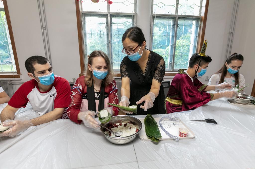 活动现场,留学生们身着汉服,诵读端午节诗词,互相表达端午祝福。并在食品药品学院专业教师指导下动手学习包粽子。老师向学生讲解包粽子的材料搭配和制作过程,演示包粽子手法,并手把手教他们叠粽叶、填糯米、放蜜枣、系绳子、包粽子。在包粽子的过程中,留学生通过网络连线国外的家人朋友,分享自己的喜悦,让家人真实地看到学生在学校丰富多彩的学习生活。