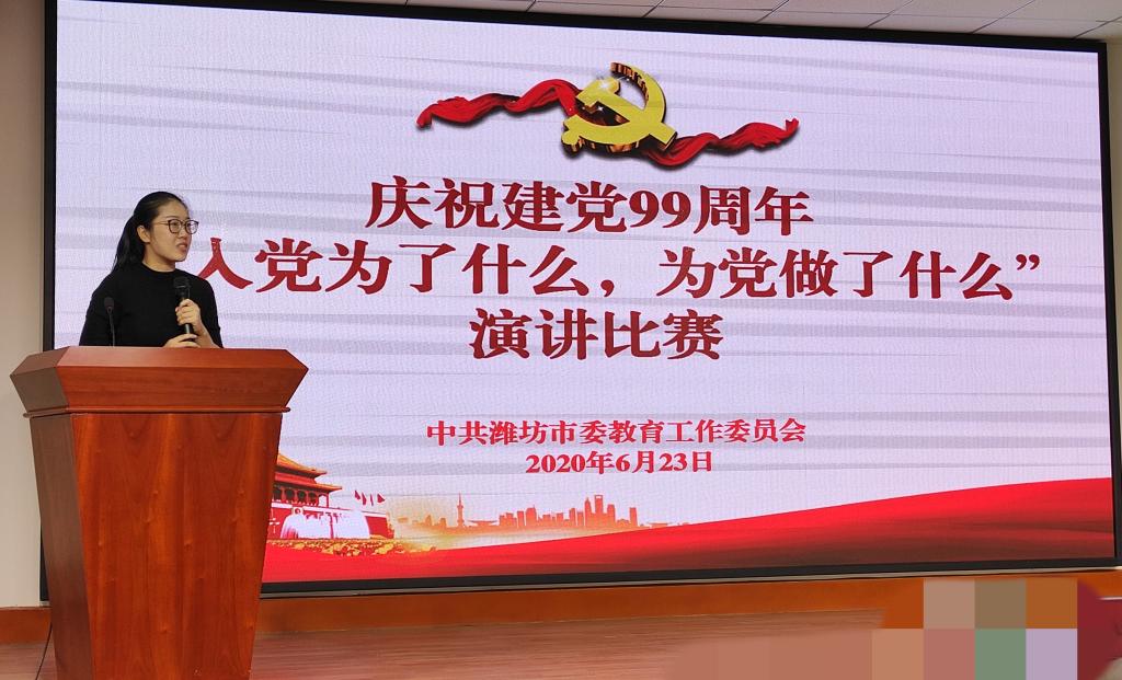 为热烈庆祝中国共产党成立99周年,进一步加强教育系统党的建设,强化思政教育和爱国主义教育,6月23日上午,由潍坊市委教育工委主办的“入党为了什么,为党做了什么”主题演讲比赛在市委教育工委党校举行。MG冰球突破官网国际商务学院党总支谭恒同志代表学院参加比赛并获二等奖。