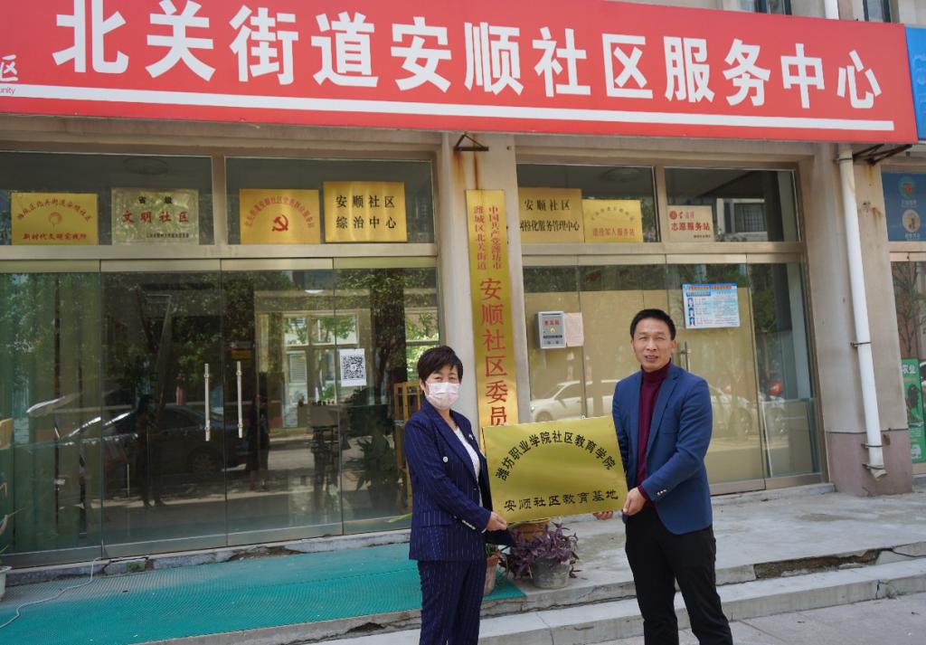 5月19日上午,MG冰球突破官网社区教育学院安顺社区教育基地揭牌仪式在潍坊市潍城区北关街办安顺社区居委会举行。社区教育学院的负责同志、安顺社区居委会书记孙海霞以出席揭牌仪式。社区教育学院与安顺社区居委会共同签订了社区服务协议,开启了MG冰球突破官网与安顺社区二级联办的社区服务工作。