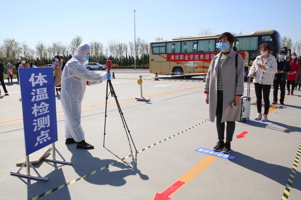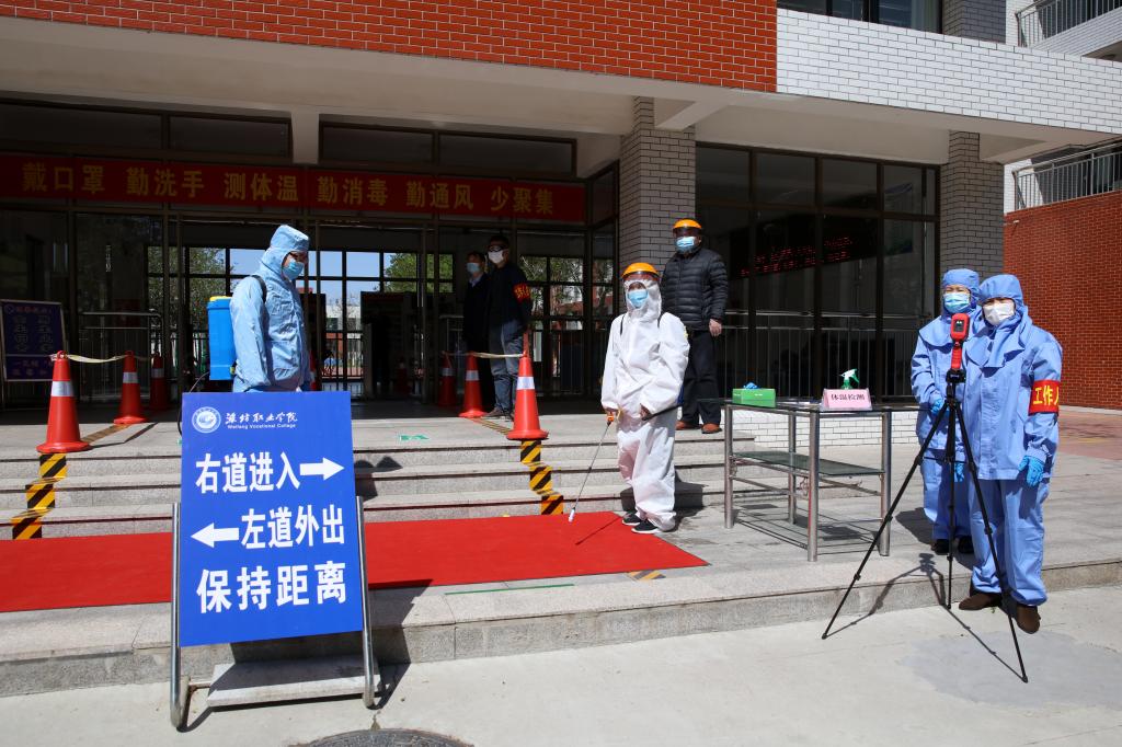 演练设6个工作组,按照学生返校、入住公寓、食堂就餐、课堂教学4个场景对发热应急处置、消杀消毒等各个场景和环节进行了全方位、全流程、全仿真模拟。在返校报到入口,模拟演练车站接站返校、乘私家车返校、乘公交车返校3种报到流程,对学生进行体温检测、身份核验、发放通行卡。演练了发现学生发热应急处置程序。在餐厅,学生按规划路线依次测温、洗手消毒后,按照间隔2米排队取餐,取餐后单人单桌单向用餐。在学生公寓,学生排队出示通行卡、测量体温、消毒、入住,每日进行日常晨午检。在教学楼,体温合格者有序进入教室,学生单人单桌,按标识入座。演练了学生、教师自感身体不适应急处置流程。