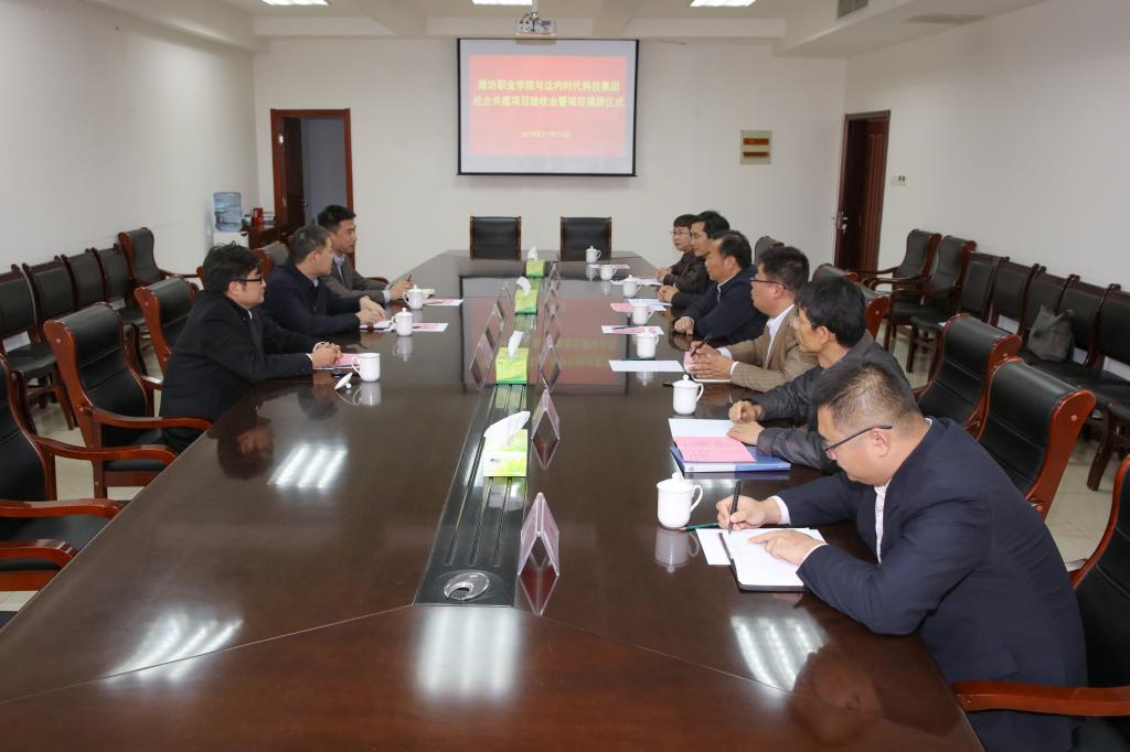 为深入推进产教融合、校企合作,11月13日下午,学院在奎文校区举行与达内时代科技集团校企共建项目验收会暨校企合作人才培养基地揭牌仪式。学院副院长贺志强,招生就业处、科技处(产学研合作中心)、资产管理处、教务处、国际商务学院主要负责同志及部分教师代表参加。达内时代科技集团院校事业部北方区总经理、专业共建全国总经理侯增辉,达内时代科技集团院校事业部北方区副总经理,以及达内时代科技集团山东基地总经理徐勇,参加此次验收会暨揭牌仪式。