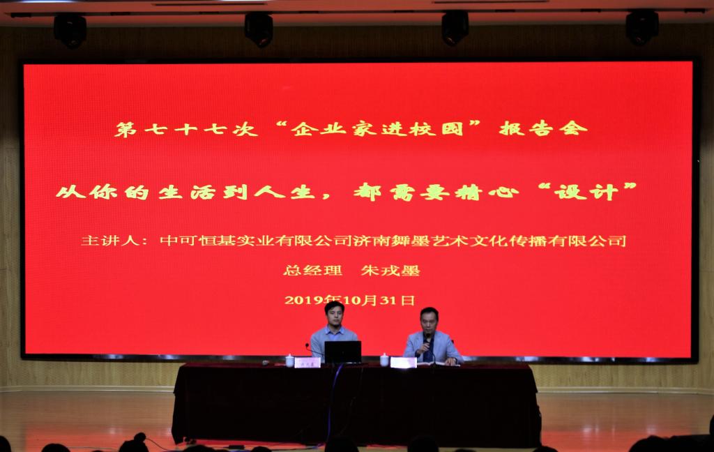 10月31日下午,学院第七十七次“企业家进校园”活动报告会在奎文校区16号楼报告厅举行。中可恒基实业有限公司、济南舞墨艺术文化传播有限公司总经理朱戎墨作了题为“从你的生活到人生,都需要精心‘设计’”的报告。科技处相关人员与文化创意学院师生300余人参加了报告会。