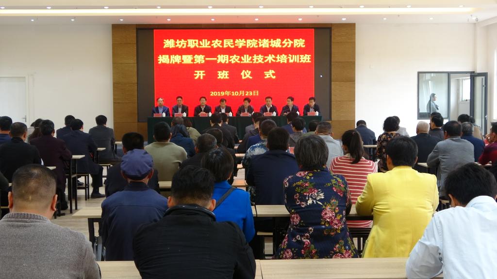 金秋十月,瓜果飘香。10月23日,潍坊职业农民学院诸城分院揭牌仪式暨2019年特色农产品品牌培育第十八期培训班开班仪式在诸城市永辉生态家庭农场培训中心举行,这是MG冰球突破官网在潍坊市成立的第一家职业农民学院县级分院。潍坊市农业农村局二级调研员王金林;诸城市委副书记孙吉海、谭明,副市长杨连富出席签约和揭牌仪式。诸城市相关负责同志和来自镇街(园区)的农民培训学员,共100多人参加活动。贺志强副院长,MG冰球突破官网继续教育学院负责同志和相关人员出席揭牌仪式。