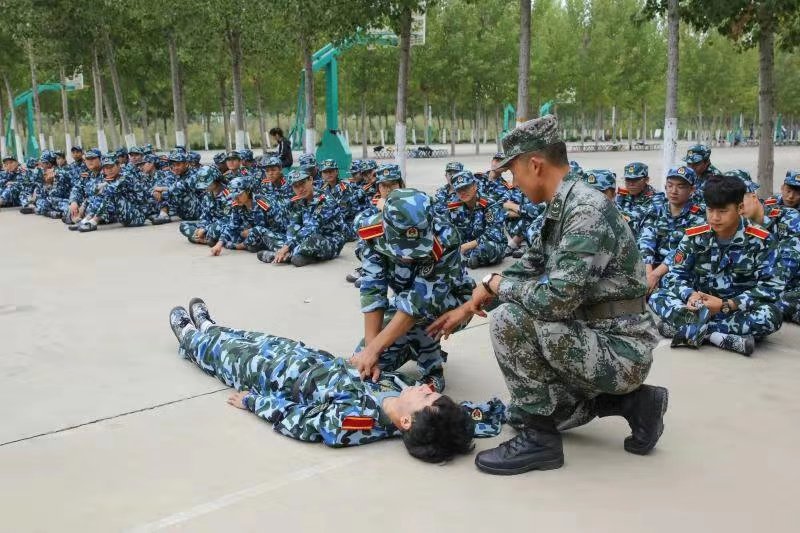 军训教官在现场为全院新生开展了生动有趣的教学和专业的示范。培训从最基本的救护知识和理念开始,详细讲述了心肺复苏、意外伤的救护以及战场自救互救要点。技能培训环节,同学们在教官指导下进行了心肺复苏术和止血包扎术的演练。