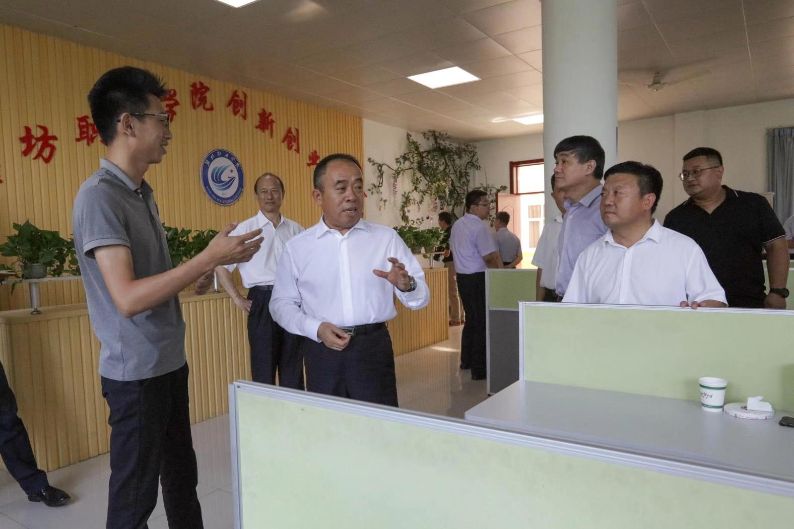 初宝杰一行实地参观了潍坊市大学生“互联网+”创业中心、留学生学习室、学院办学成果展、学生餐厅和潍坊职业农民学院办学成果。马跃启向初宝杰一行简要汇报了学院在党建工作、优质建设、人才培养、校企合作、职业技能大赛、创新创业等方面的情况。